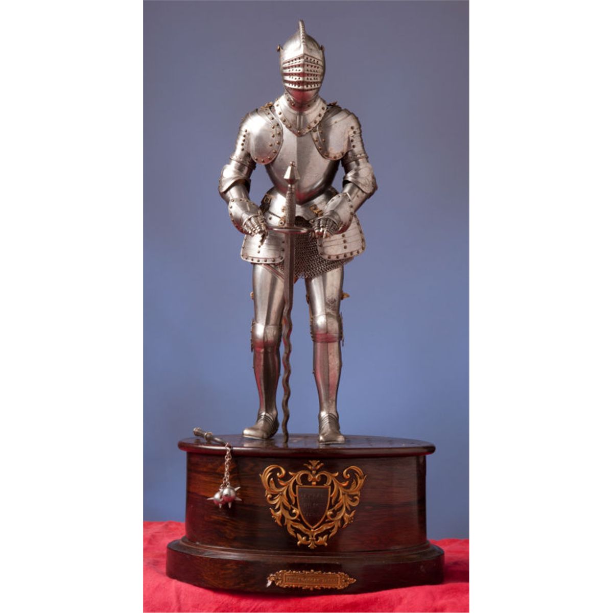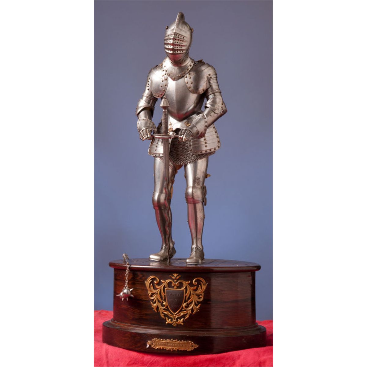 Fine Miniature Suit of Armor in the 16th Century German Style by Edward Granger, Paris. The renowned European maker of miniature armor, this finely crafted example exemplifies the quality and attention to detail noted by this firm. This suit, the close helmet with fully articulated bellows type visor and roped comb crest to the movable joints; the breast-plate fitted with rear chain mail skirt and tassets; back-plate; full arm defenses including finely detailed gauntlets, full leg armor with rowel-spurs and wide sabatons, all depict the 16th century German knight in a lifelike and extremely handsome manner. Mounted on an oval plinth of dark rosewood, the base is perforated with small openings, allowing the knight to be placed in a variety of positions, displaying the range of movement allowed in a suit of this type. The weapons, a serpentine broadsword and spiked flail are also highly detailed. The plinth bears an ormolu escutcheon with the raised legend in a bronze shield reading: Armure/ Du 16th/Siecle. Below this, a small gilt plaque with floral border reads: Edrd Granger Fecit. Height: 16-inches.Condition: Fine to excellent. Showing light age wear, minor spotting and patina. A few leather straps need minor repair. Overall, a unique and difficult to find example.