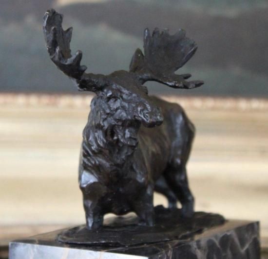 Fine Moose Bronze Sculpture, After L. Carvin, 7 inH x 3 inW x 2 3/4in D 8lbs. This bronze sculpture was produced using the Lost Wax casting method. The Lost Wax Cast method is the most precise metal casting technique in existence, ensuring exquisite detail of the original host model which is usually sculpted in clay or wax. This Lost Wax casting method is an extremely labor intensive and expensive process, but the end results produce a Heirloom Quality Masterpiece!