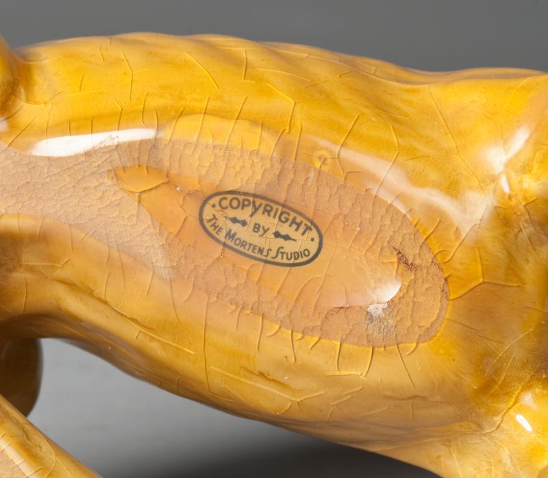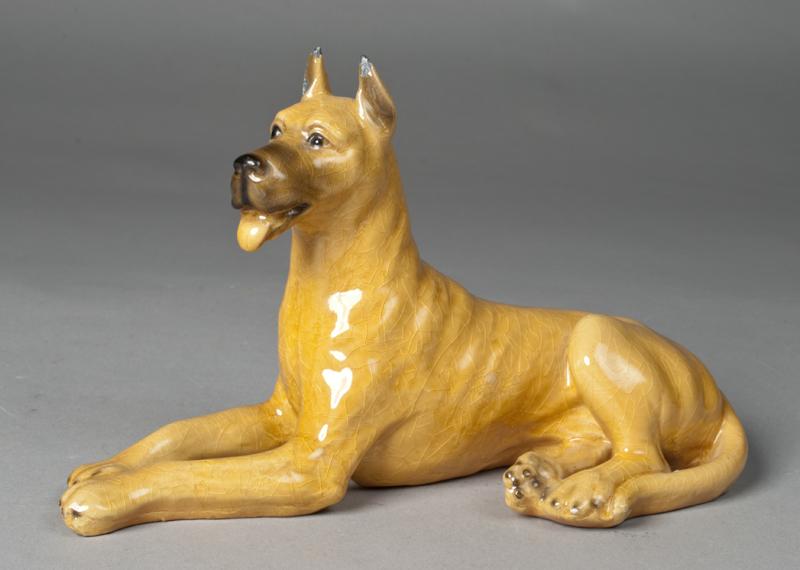 Lying Great Dane, by Mortens Studio. Crazing to glaze, several glaze chips around ears. 5.25" H x 8.25" L.
