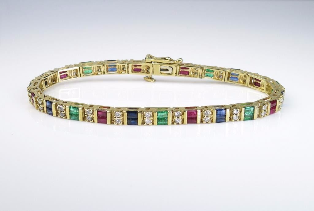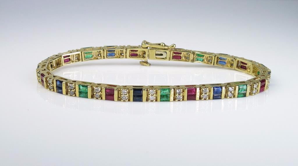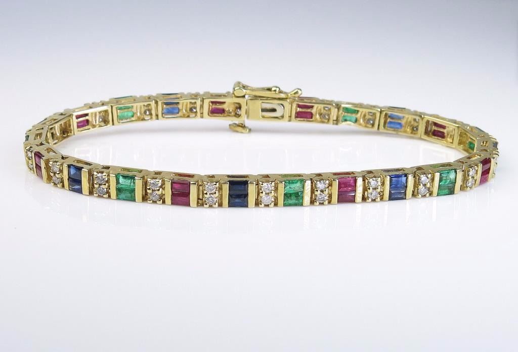 Fine Multi-Gem and Diamond Bracelet featuring 46 baguette cut Rubies, Emeralds and Blue Sapphires weighing a combined weight of approx. 3.00 carats perfectly complimented with 46 round cut diamonds weighing 1.00carat set in 14 karat yellow gold. Retail $3,500-$4,000 Estimate $2,000-$3,000