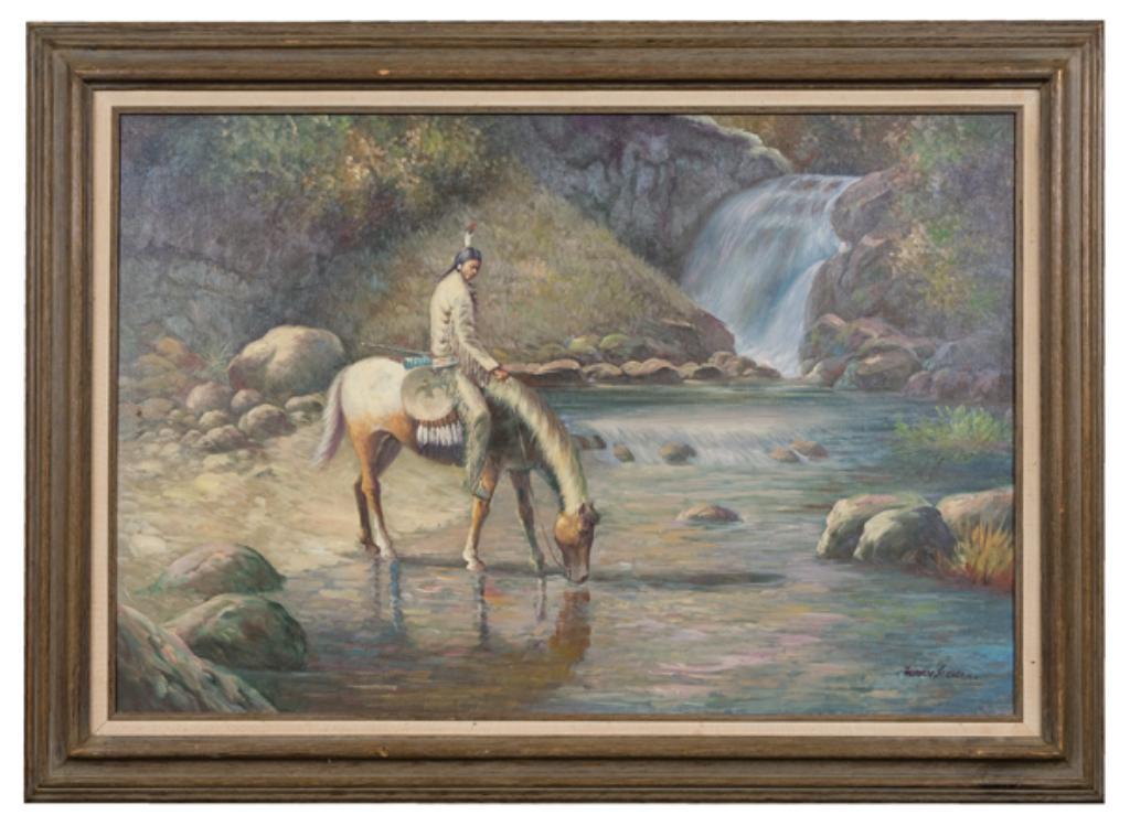 Executed Oil Painting of Native American Indian on Horse by T. Slenz 32" x 40" 400-700