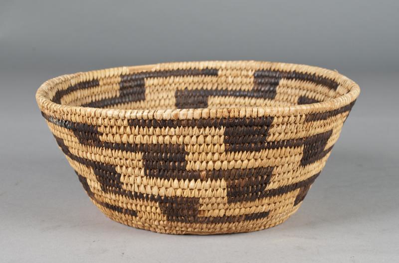 Small basket with geometric patterns throughout. 3.5" H x 8.5" W. 1" of breaks to top and bottom rim.