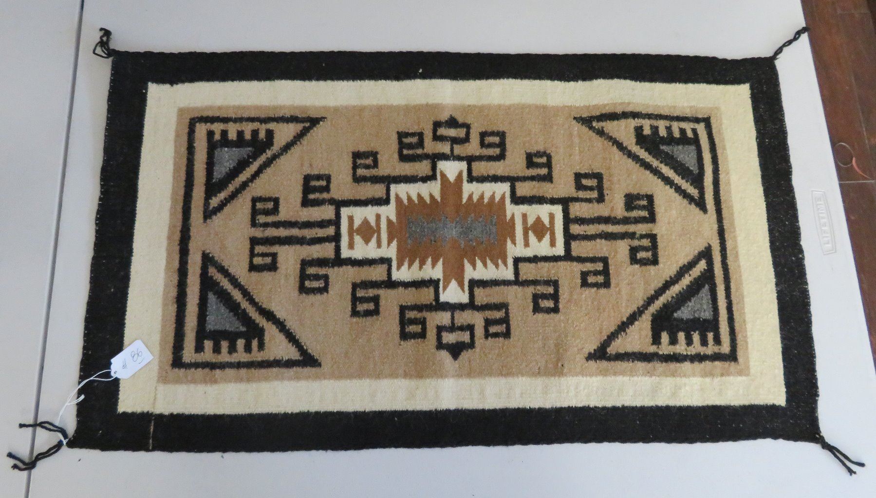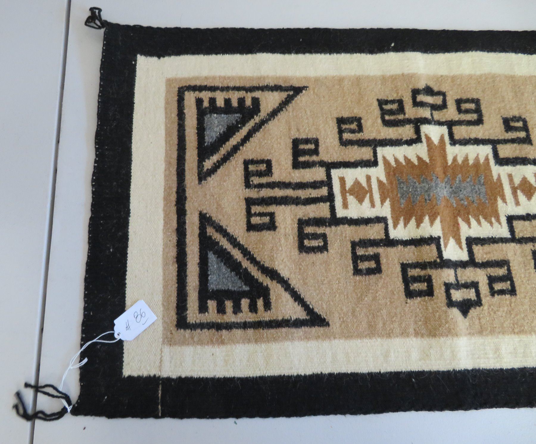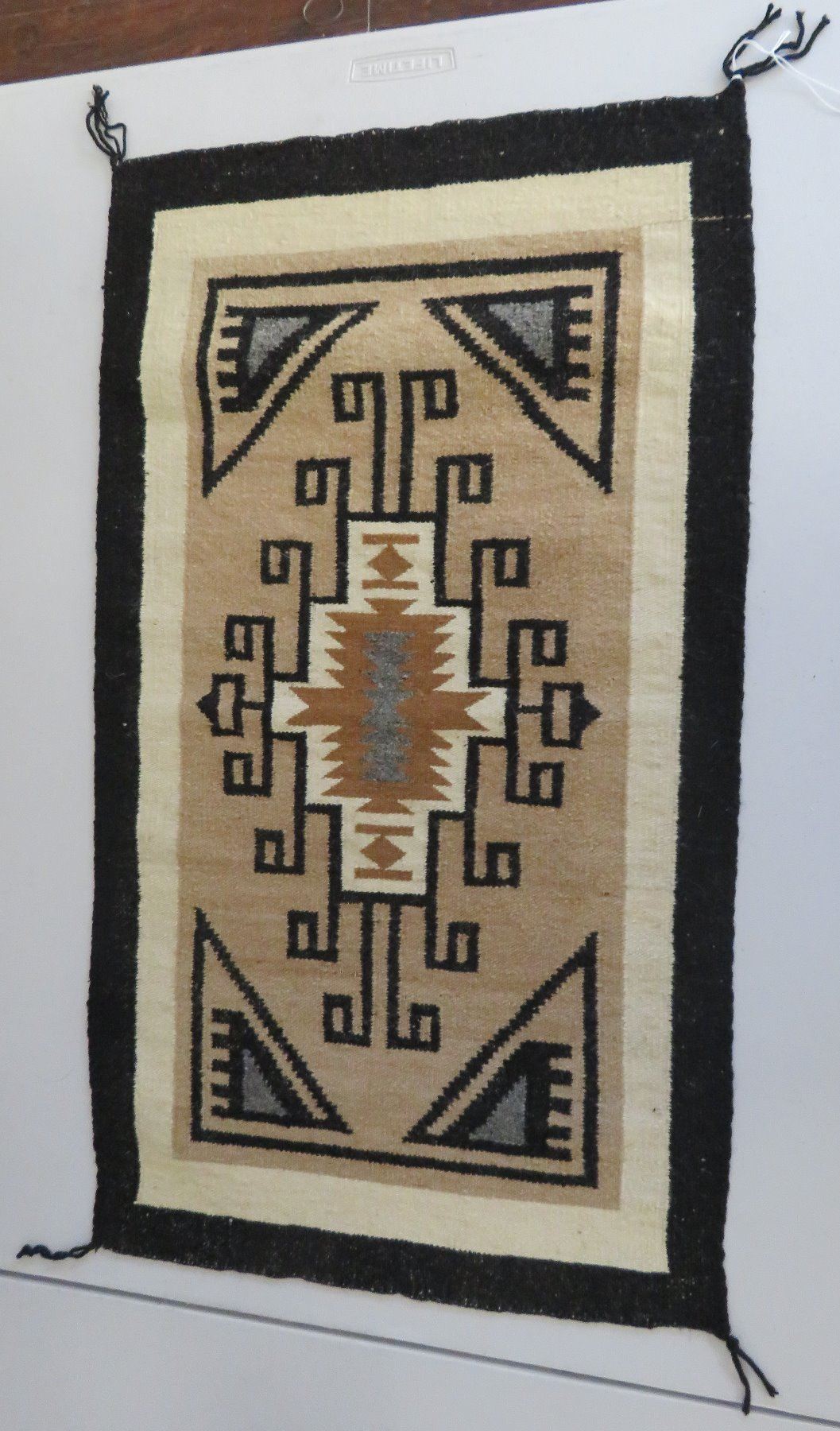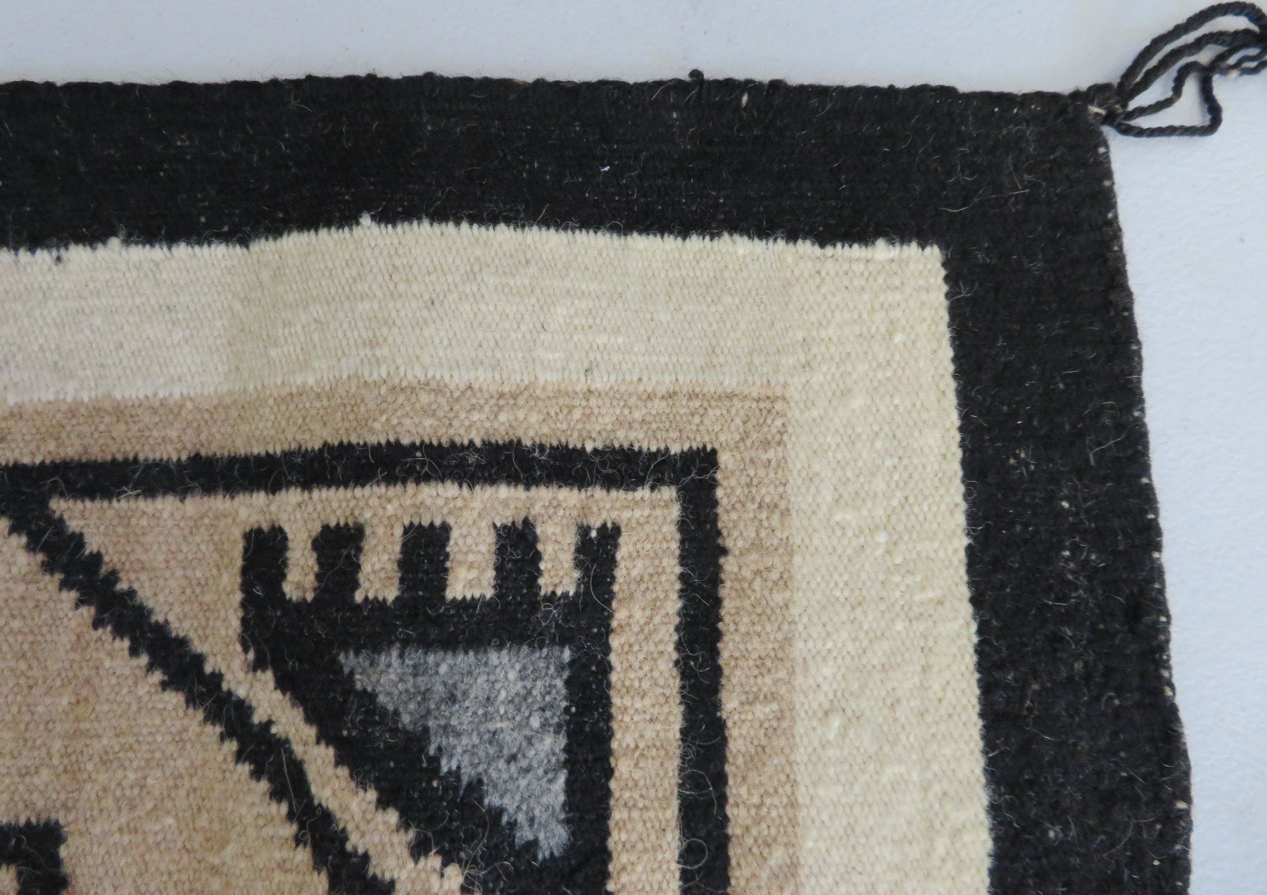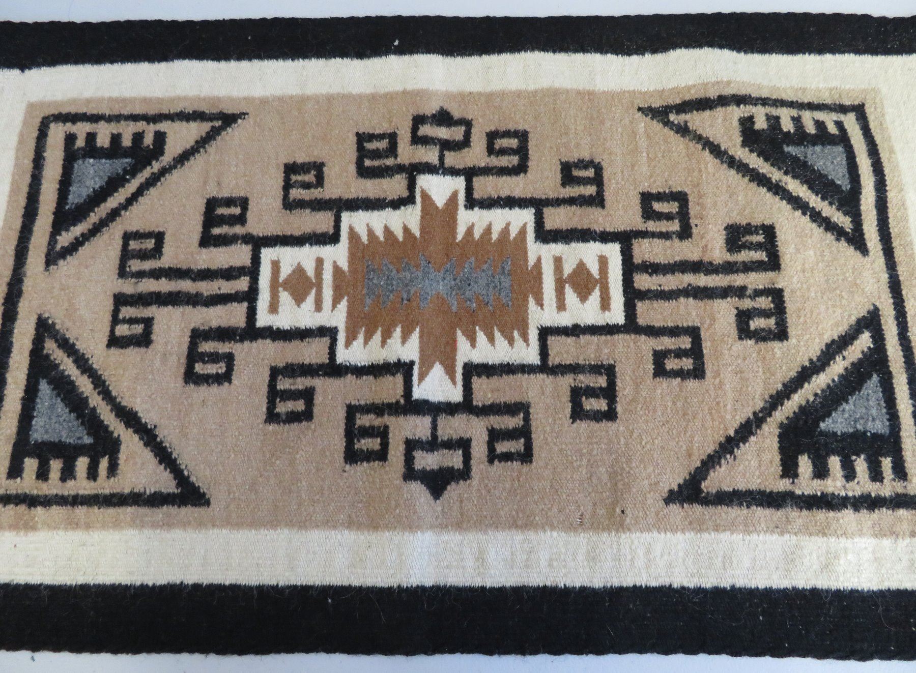 Fine Navajo Rug, c. 1940s. Made of wool, the item measures 32" x 18". New Mexico. Condition: Minor moth damage, see images. Shipping: $24.50 w/insurance and signature.