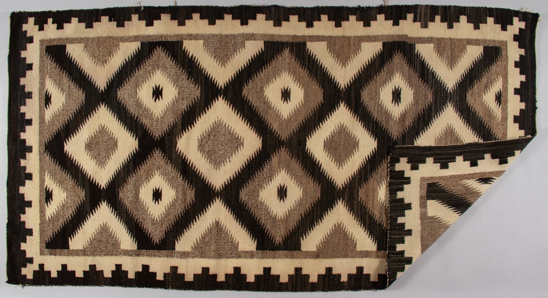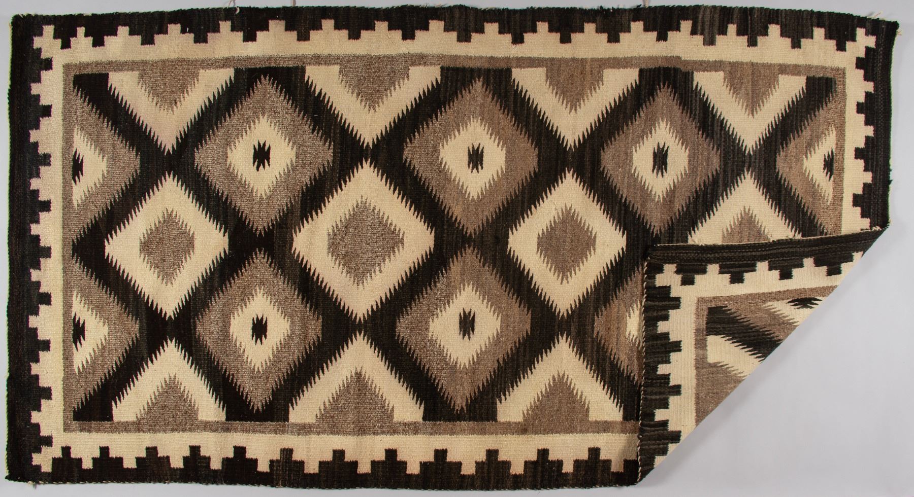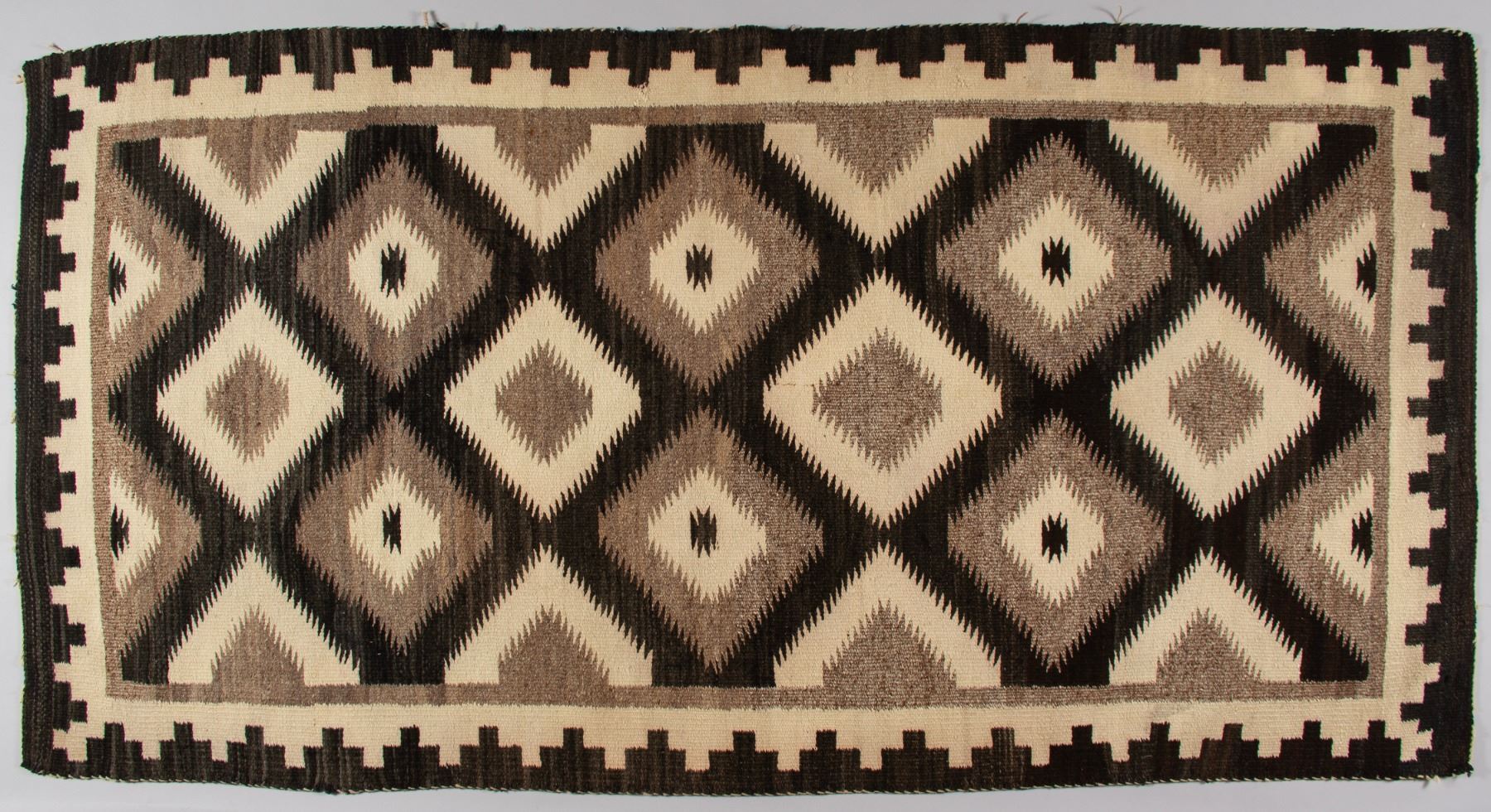 The central field features a sequence of large, interconnected serrated diamonds, a classic motif often symbolic of the Four Corners region or mountains within the Navajo belief system. These motifs are intricately detailed with interior designs and outlined by fine serrated lines. The main border complements the field with a continuous "running water" or "mountain" pattern on a light ground, framed by a dark outer edge. The use of only natural colors and the tight, fine weave quality are hallmarks of the craftsmanship associated with weavers from the Two Grey Hills and Toadlena trading areas.