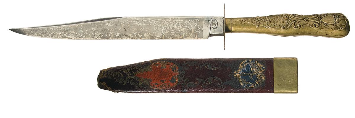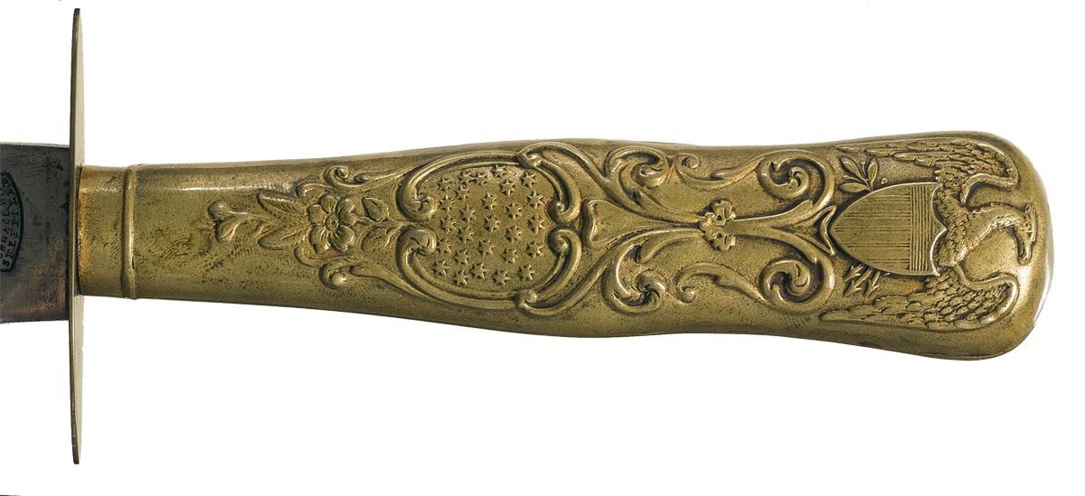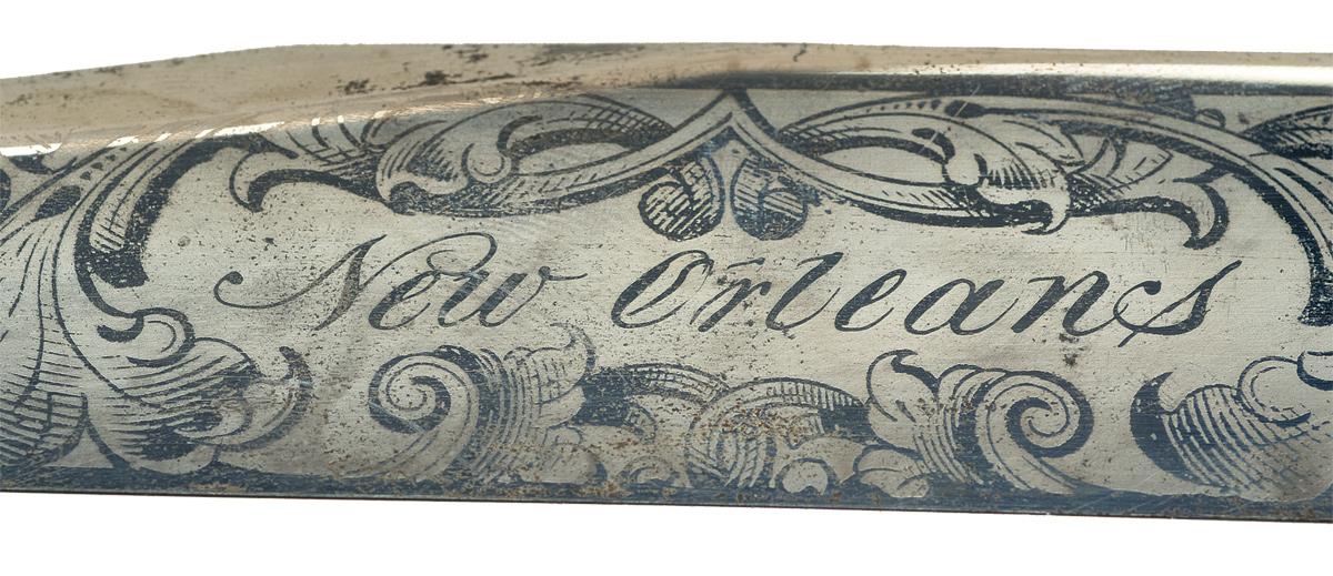 This is a fine example of a "Sheffield Bowie" manufactured by the cutlery factories in Sheffield, England for export to the U.S. in the early 1850s. The famous version of the Bowie knife was designed by James Bowie and presented to Arkansas blacksmith James Black. Black produced the knife Bowie had ordered and at the same time created another based on Bowie's design but with a sharpened edge on the curved top edge of the blade. Bowie choose the modified version when Black offered him a choice. These knives with the sharpened top edge are today called the "Sheffield Bowie". The Bowie knife became famous after Jim Bowie used such a knife in the "Sandbar Fight" which was the famous 1827 duel between Bowie and several men including a Major Norris Wright. The fight took place on a sandbar in the Mississippi River across from Natchez, Mississippi. Bowie was stabbed, shot and half beaten to death, but managed to win the fight. This knife has a 8 3/4" clipped point blade with floral etching on one side with "New Orleans" in script in the center. One side of the blade is stamped "S - C - WRAGG / 25 / FURNACE HILL / SHEFFIELD" near the handguard. The handguard is thin brass and the handle is solid brass with relief decorations of a spread wing eagle and shield at the top, scroll patterns, 27 stars and floral designs. OAL: 13 1/2". The knife is complete with an original leather tooled sheath with a brass throat. Some of the patterns are painted different colors. The most accurate version of Bowie's death at the Alamo was that he died in his cot with his back against the wall using his pistol and famous knife.