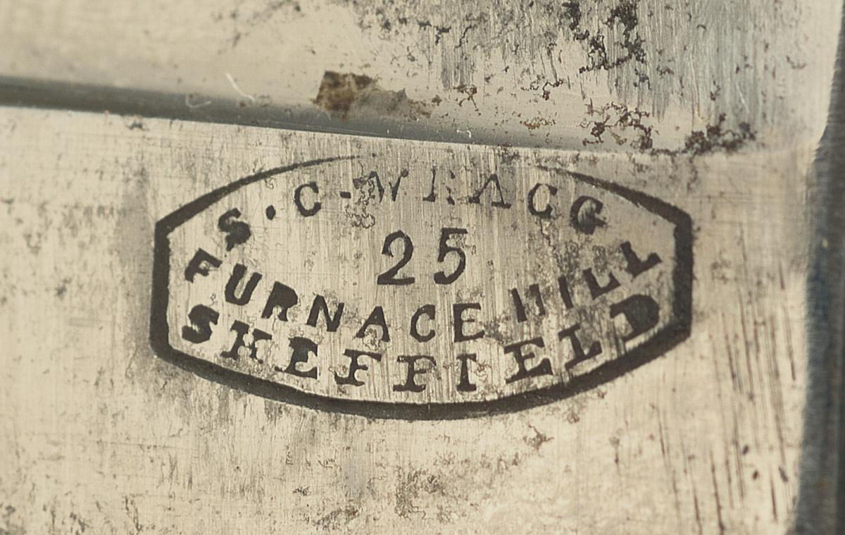 Condition: Very fine. The blade remains bright with some small patches of discoloration and some light spotting. The etching 100% intact and excellent. The handle has an aged patina. The sheath is about good. The tips shows some heavy wear, and splitting and the tip is missing causing the blade to protrude approximately 1".