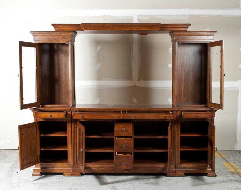 Made by Winners Only. Includes center base with two small top drawers, three center drawers and two cupboards with beveled glass and two shelves, 36" H x 54" W x 19" D. Left and right media base, each with two small top drawers, and cupboard doors with two shelves, 54" H x 21.5" W x 19" D. Left and right lighted hutch with beveled glass doors, and two glass shelves, 40" H x 24.25" W x 14.25" D. And a bridge with crown molding, 3.5" H x 72" W x 18.5" D. Very good to excellent condition. Retails for $3000.