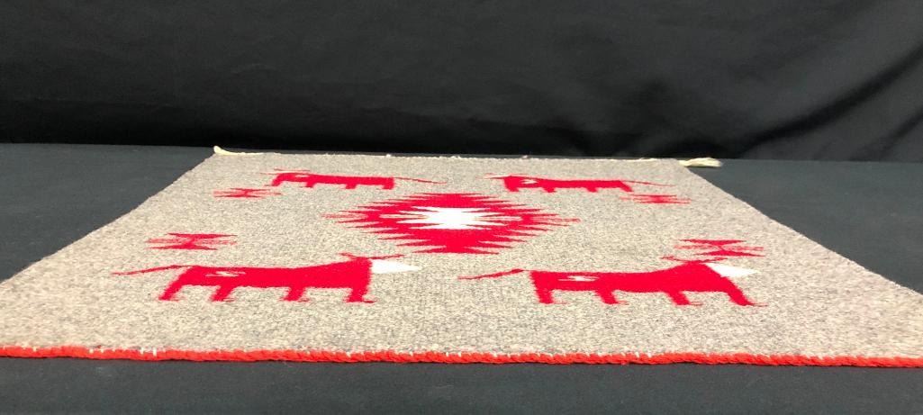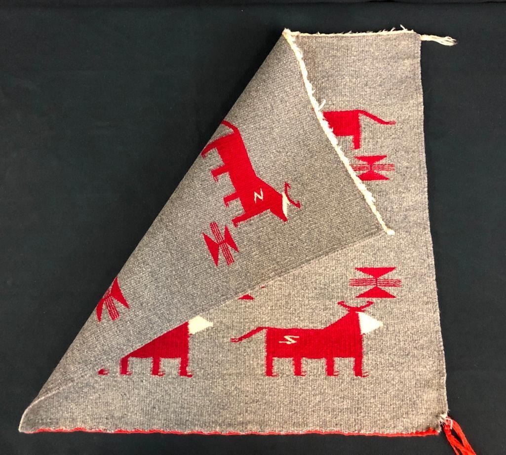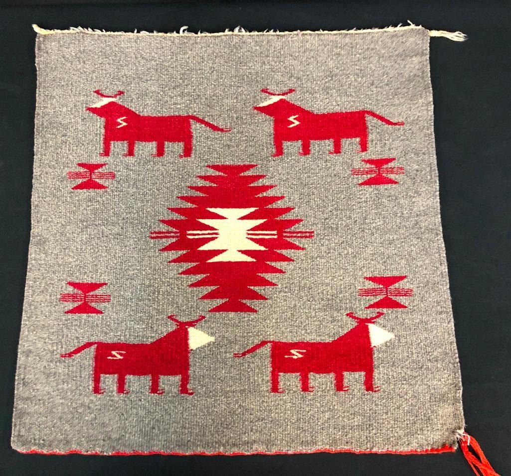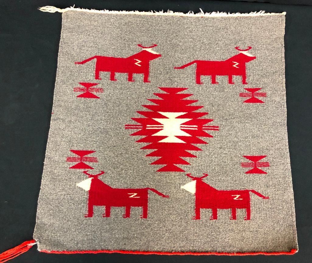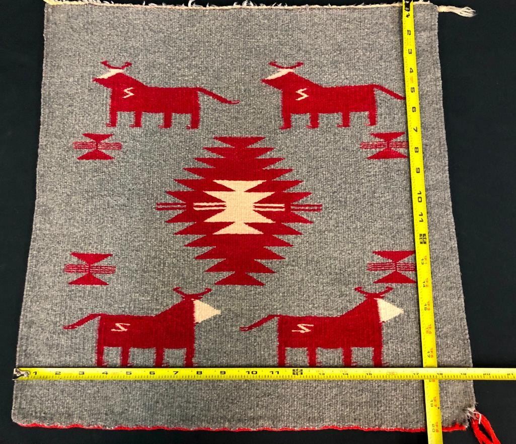 Presented for sale in this lot is a fine old Navajo pictorial weaving made with Germantown yarn. It features red bulls with white faces and a gray background. This is a nice little old pictorial textile and it would look great in your collection. MAKER: Unknown Navajo weaver. APPROX AGE: Circa early 1900s. SIZE: 19-1/2 inches wide x 20 inches long. CONDITION: Pretty good for its age, normal wear expected. Please look closely at the pictures as they are an important part of our description and are hereby incorporated into the description, specifically with regards to condition. SHIPPING: There will be a $8 handling / packaging fee for shipping this lot. The actual cost of postage will be added on top of that. BUY IT NOW: If you would like to buy this item now, without waiting for the auction day to bid on it, we do offer this option (which is available up to 48 hours before the actual auction starts). The “Buy it Now†price is the high estimate of this lot (plus applicable fees and the Buyer's premium is discounted to 10% when using the Buy it Now option). If you would like to exercise this option, you must contact us by email (or phone as long as you talk to someone live). Reference this lot number and your intention to "Buy it Now."