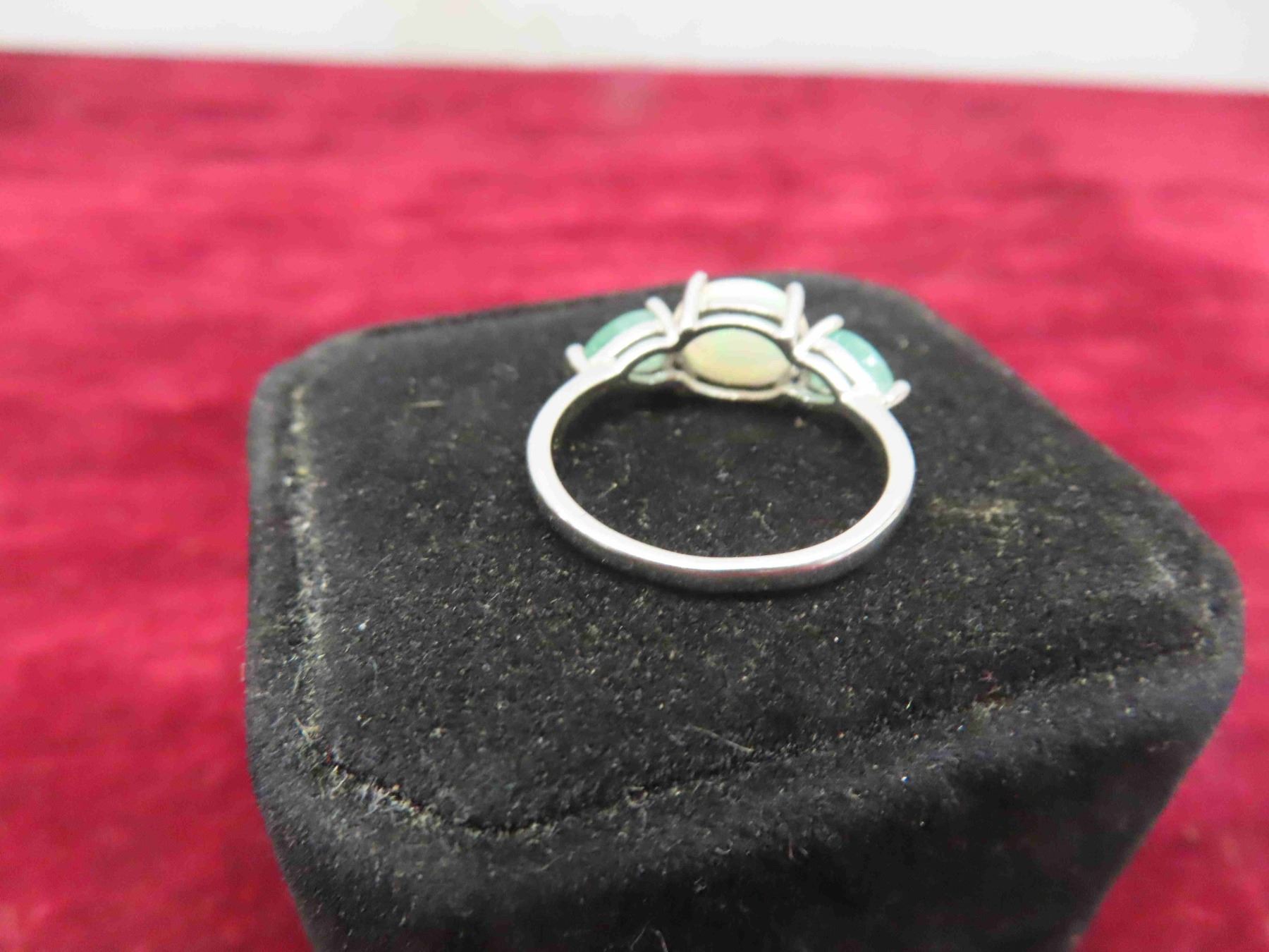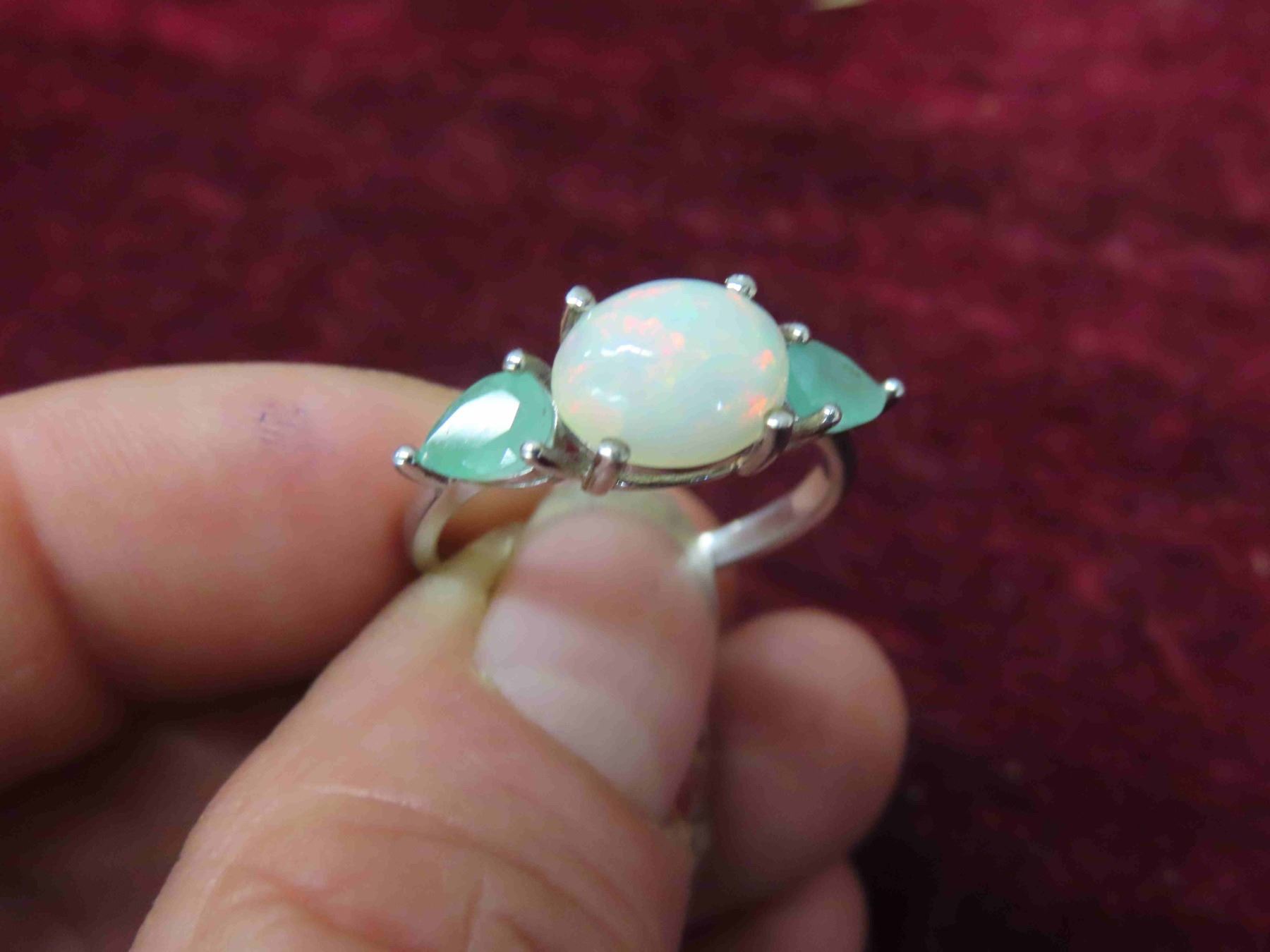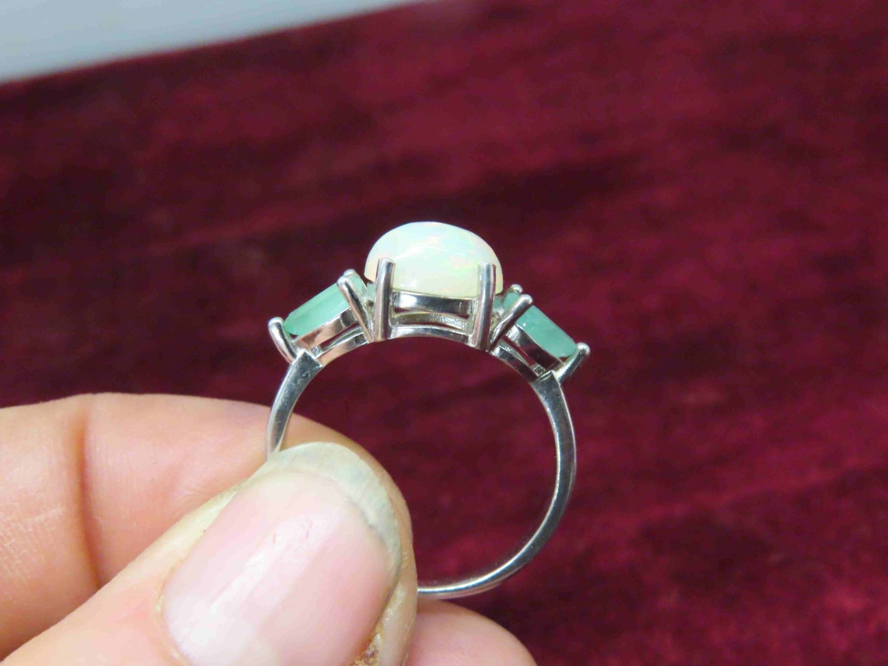 Fine Opal with 2 Emeralds Mounted on 8925 Silver Ring , Size 7.