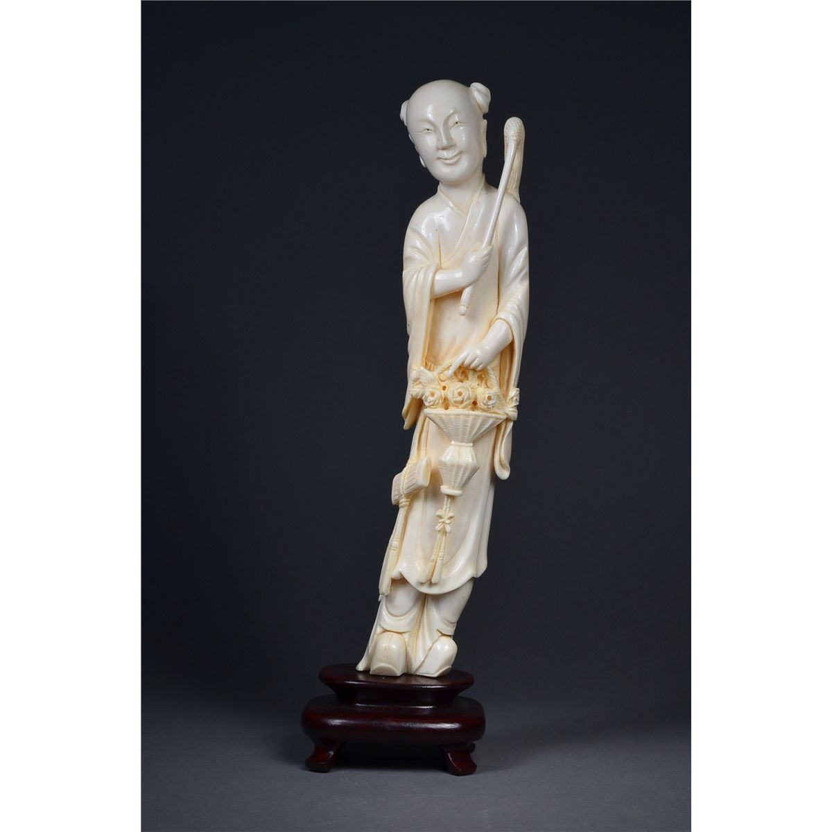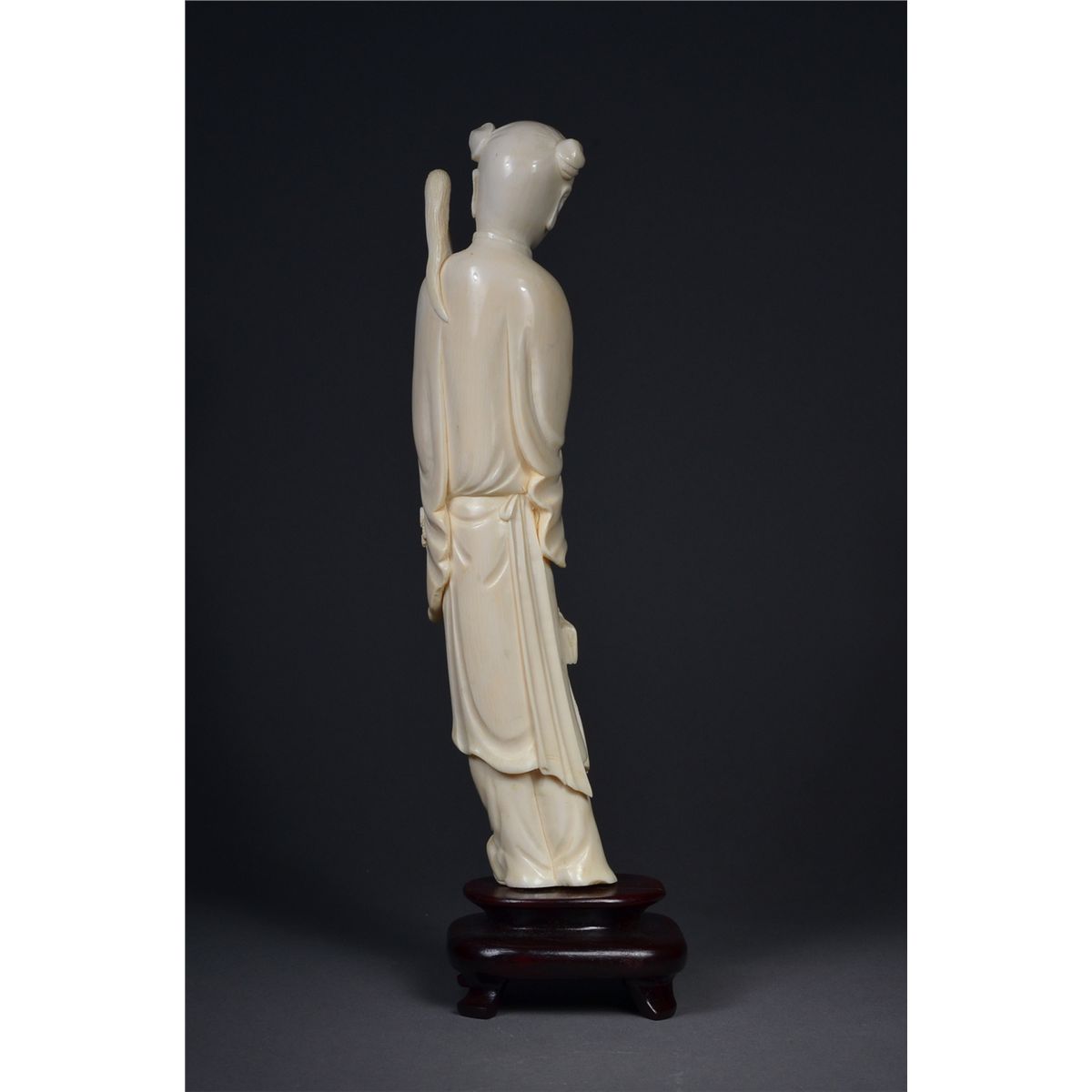 Fine openwork Chinese carved ivory immortal; H: 26 cm with wood stand.