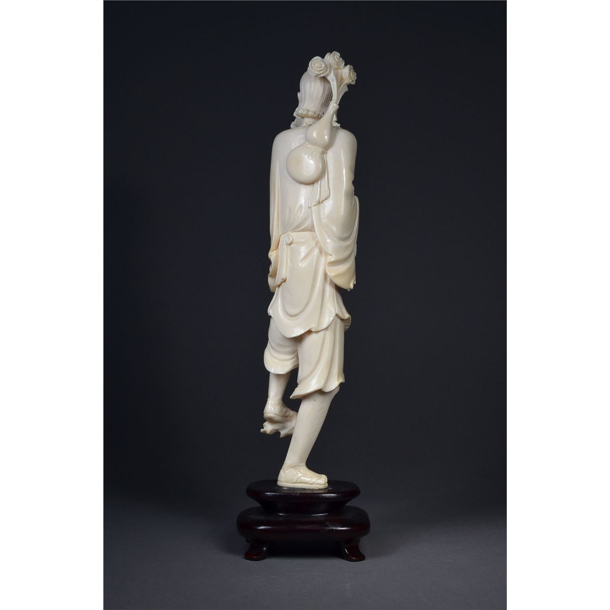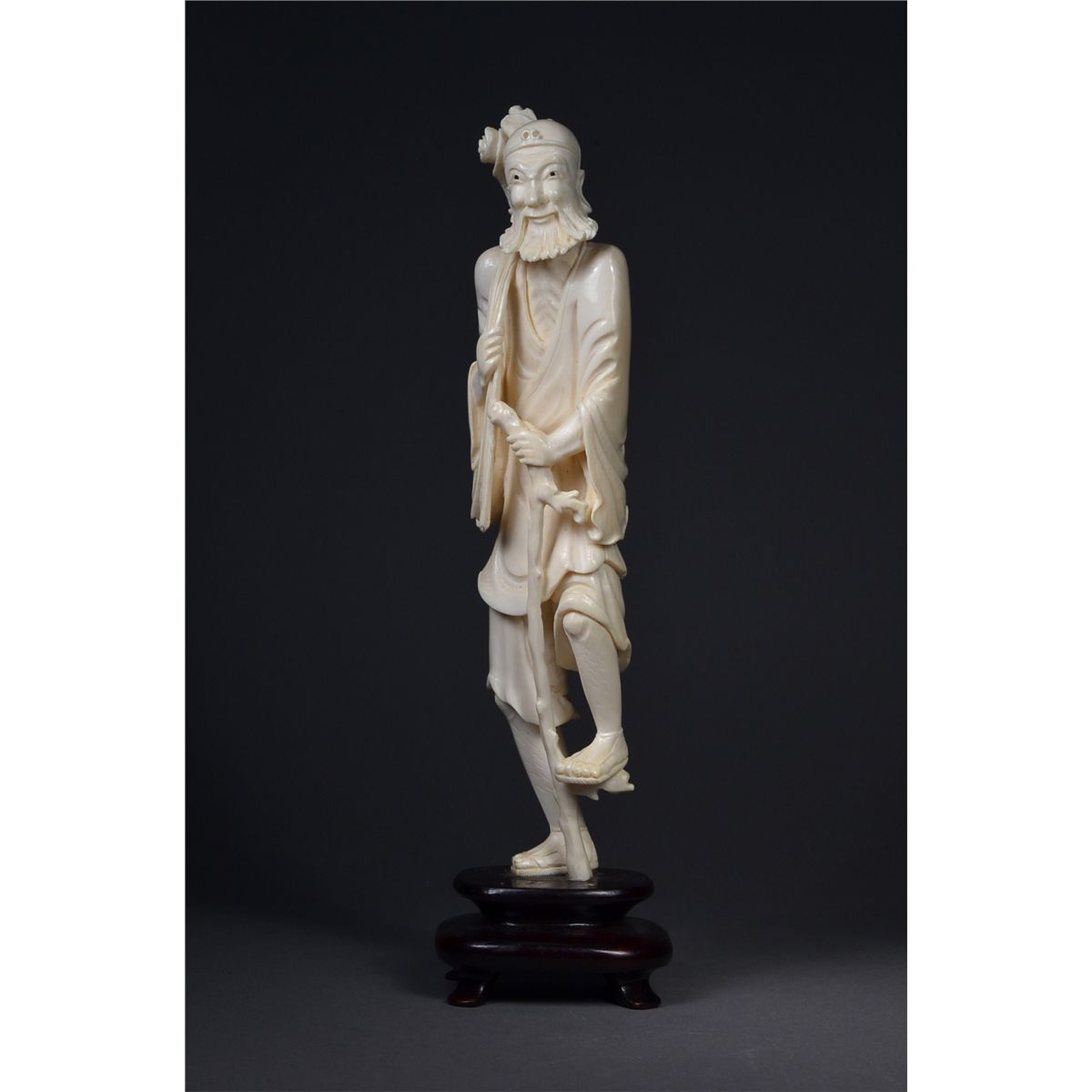 Fine openwork Chinese carved ivory figure of old man; H: 30 cm (including stand)