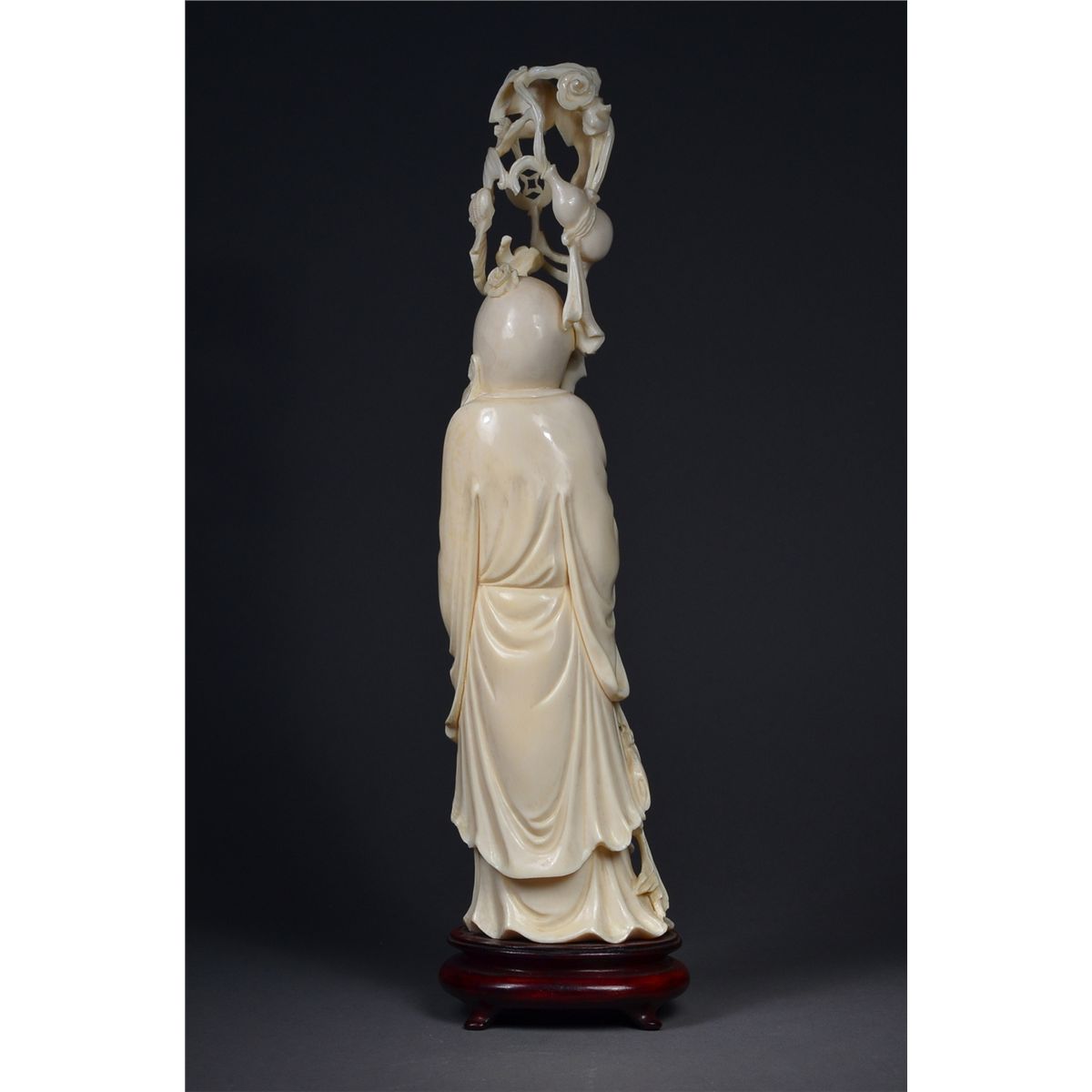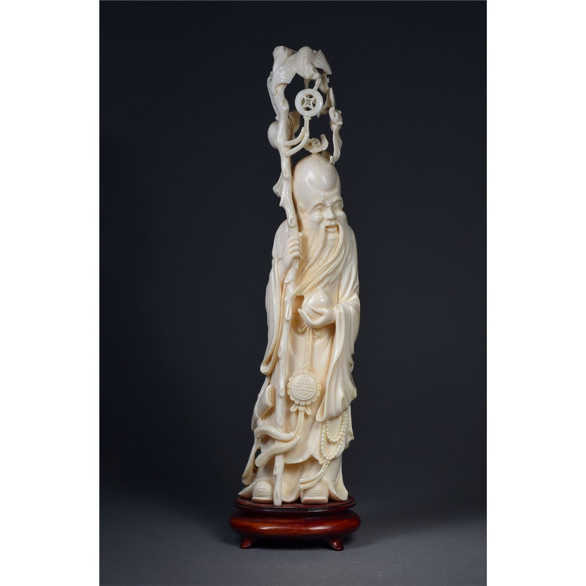 Fine openwork Chinese carved ivory Shou Lao; H: 34 cm (including stand)