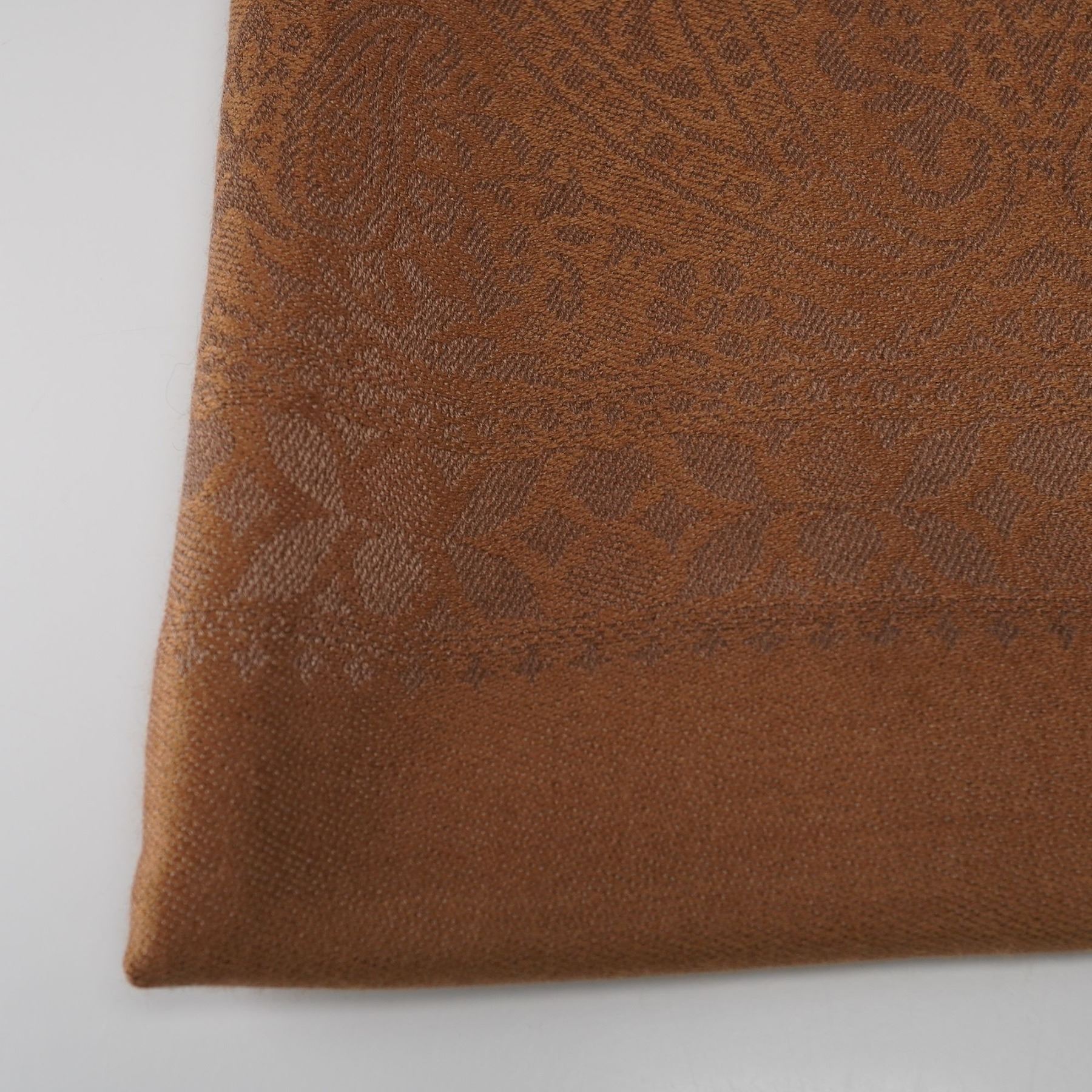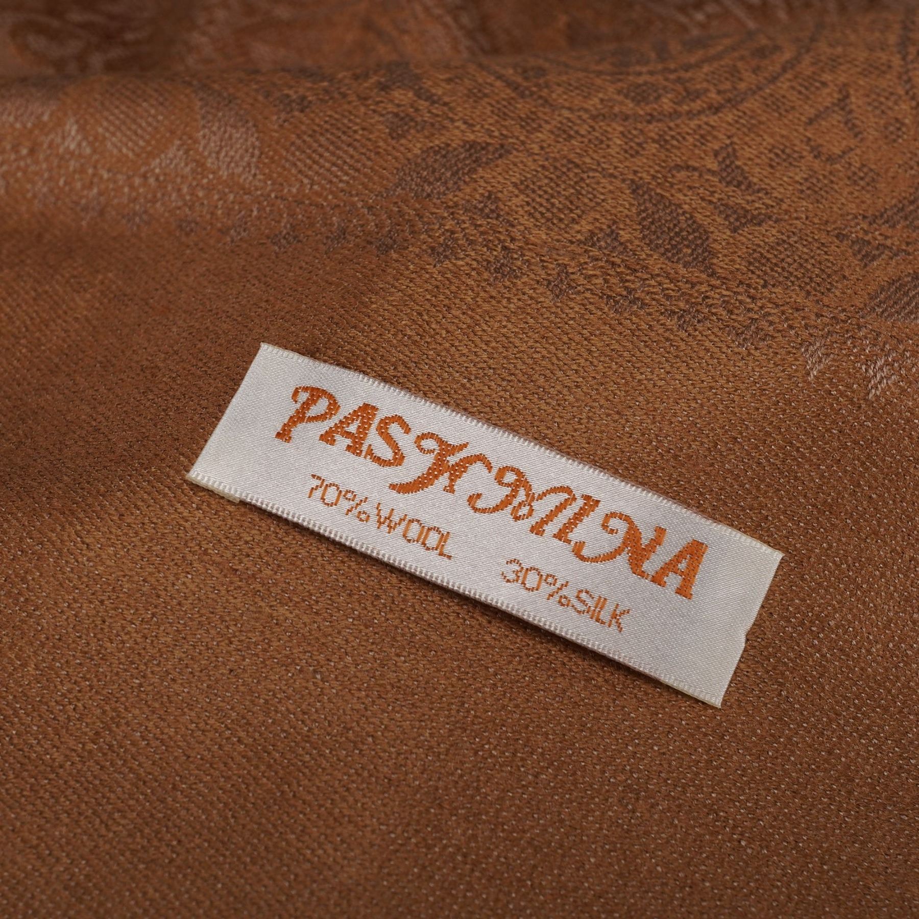 A beautifully woven Pashmina shawl crafted from a luxurious blend of 70% wool and 30% silk, this piece exudes timeless elegance and softness. The textile features an intricate woven paisley and floral design, subtly integrated into the rich caramel brown ground, creating depth and texture without overwhelming the natural sheen of the silk fibers. Finely twisted fringe edges complete the hand-finished look, adding a delicate movement and artisanal charm. This shawl combines warmth, lightweight drape, and understated sophistication, ideal for both formal and casual ensembles.