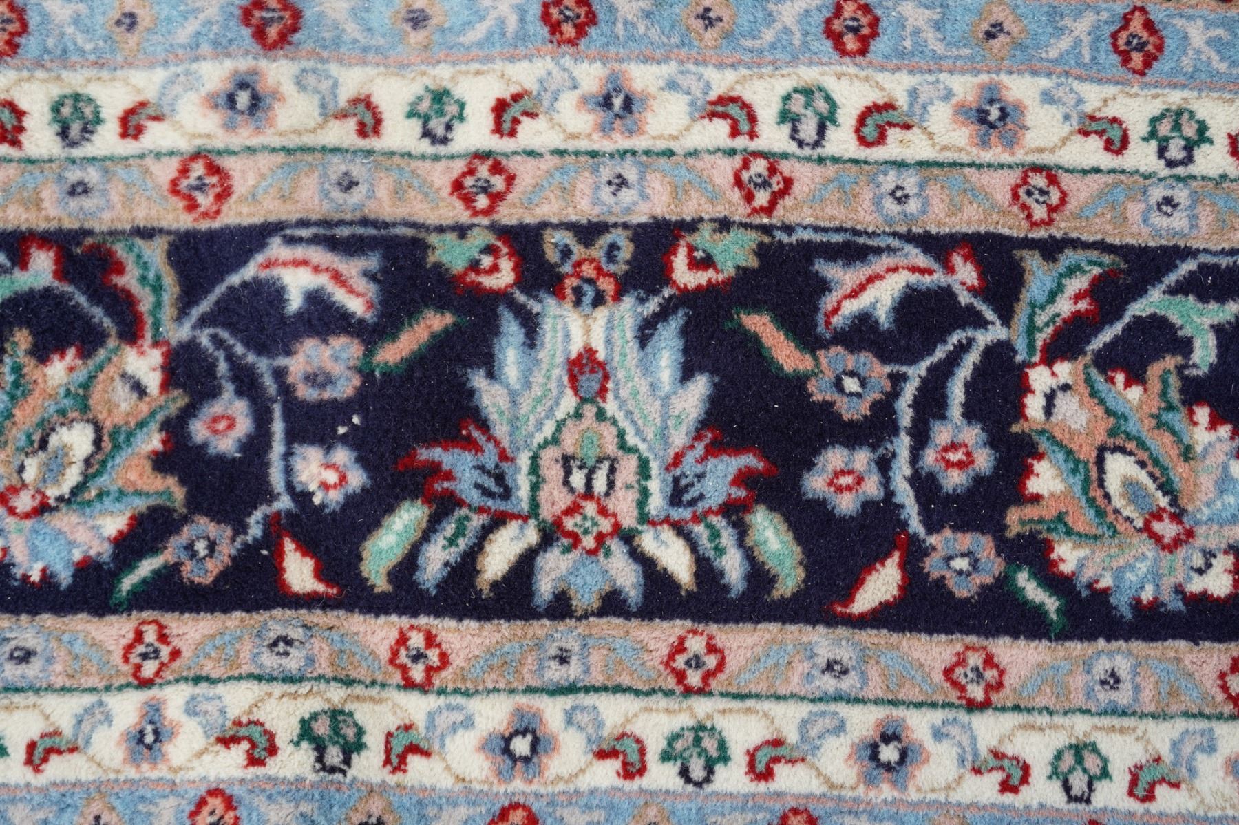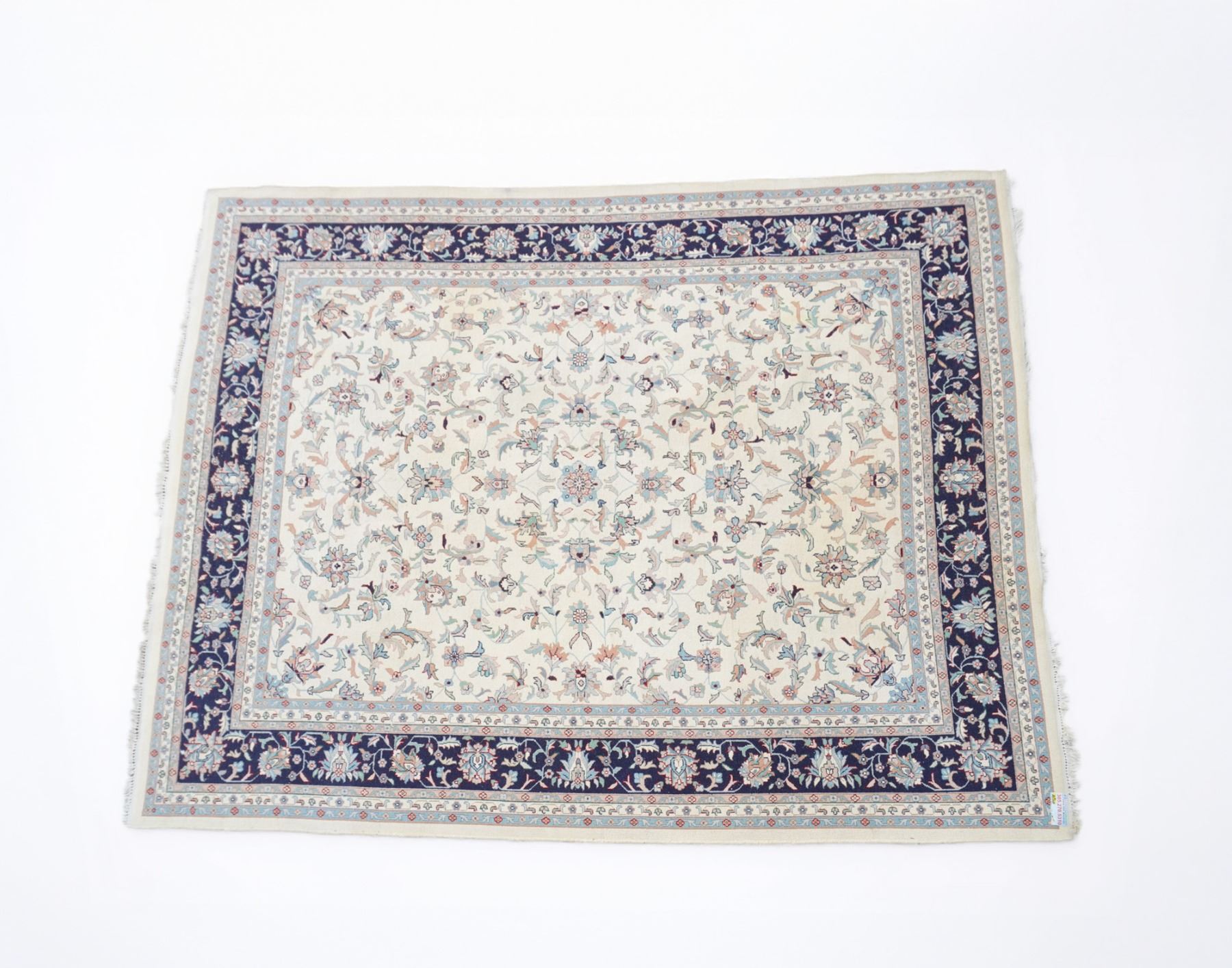 An exquisite hand-knotted Persian Nain rug, finely woven with exceptional craftsmanship and a timeless floral motif. This elegant carpet features a luminous cream color field intricately adorned with stylized palmettes, vines, and blossoms in soft tones of sky blue, rose, sage, and navy, all encased within a striking midnight blue border enriched by complementary guard stripes. The wool pile is luxuriously soft and dense, revealing the meticulous precision characteristic of the Nain weaving tradition. Its refined palette and balanced symmetry create a sense of harmony and sophistication, making it ideal for both classic and contemporary interiors.