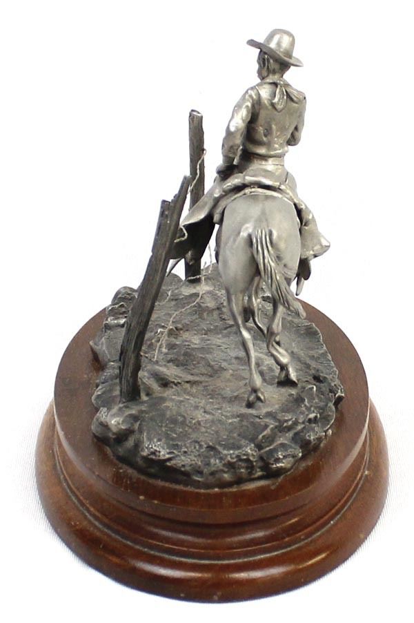 Fine Pewter Sculpture By Polland, One of 2500 made by Chilmark in the USA, called ''The Line Rider'', which in turn shows the Cowboy on his horse checking the miles of Fencing. Measures 6''T x 7''L x 4''W