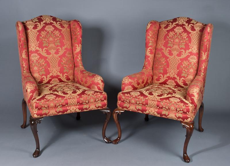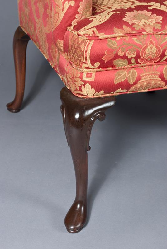 With carved cabriole legs and upholstered in red with gold and green floral, urn and scrolling designs. 44" H x 29" W x 31" D. Very good condition with minor wear from use.