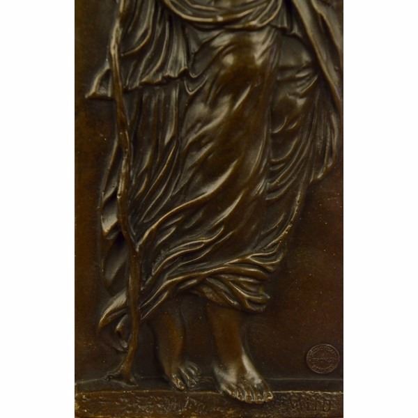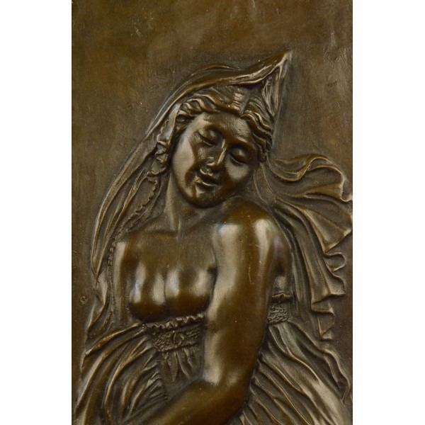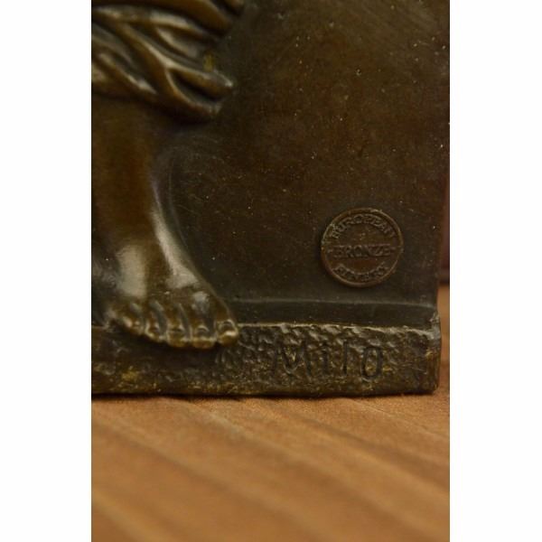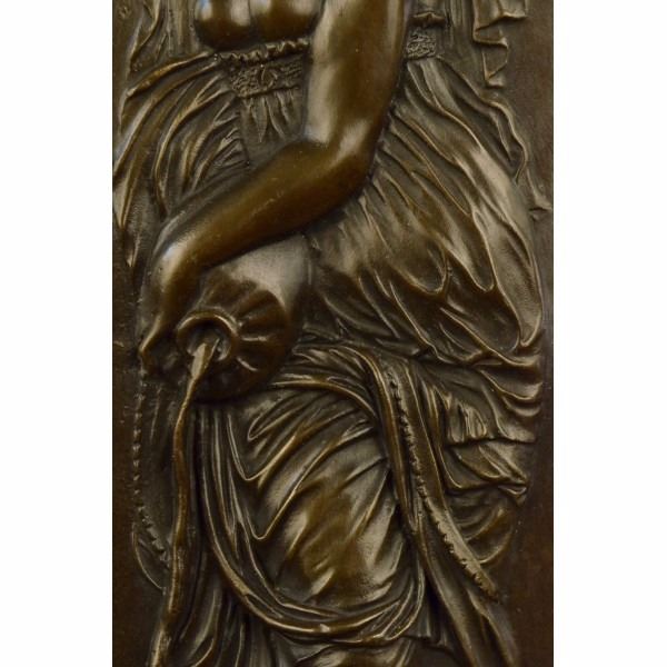 This sculpture of a woman holding a vase filled with water, which she is emptying is exquisite. She has this beautiful long and droopy dress that leaves her breast bare, so its place right under her chest. She seems to not care and continue doing as she was doing, She has a hood that looks more like another big drape hanging off her head. She is a lovely woman full of grace and elegance. She is bare foot walking through he park with her water vase. She is cast using the ancient old "Lost Wax Method" stained in brown patina. 100% handmade and 100% bronze, signed by the artis Milo Condition: This sculpture is in perfect condition. Bronze Dimensions :Height 18" x Width 5" Weight : 5 LBS Inventory 41Y8384284
