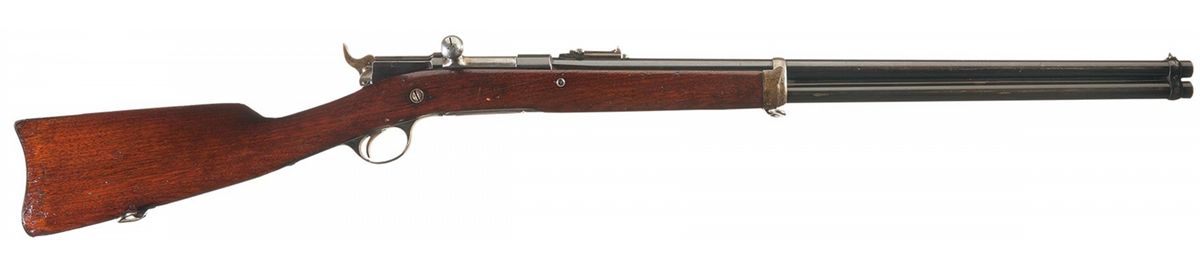 The Keene bolt action system was Remington's first attempt at producing a repeating rifle to compete with the lever action Winchesters. These were manufactured from 1880-1884 with a total production of approximately 5,000. This model was the first magazine fed rifle produced by Remington. It has a loading gate on the bottom of the rifle in front of the trigger guard. The top of the bolt is marked "E. REMINGTON & SONS, ILION, N.Y./PATENT FEBY. 24. MCH 17. 1874 JAN. 18/SEP. 26. 1876 MCH 20 JULY 31 1877". The left rear of the receiver is marked ".433" vertically. All blue finish, bright bolt and casehardened hammer mounted on the end of the bolt. Blade front sight dovetailed into the front barrel band and adjustable folding ladder rear sight graduated 1,2,3 for use with the horizontal notch and 4-10 on the right arm for use with the slide when the leaf is in the vertical position. Mounted with a smooth one-piece straight grip walnut half stock with iron forend cap and carbine style buttplate. There is a sling swivel on the buttstock and forend cap.