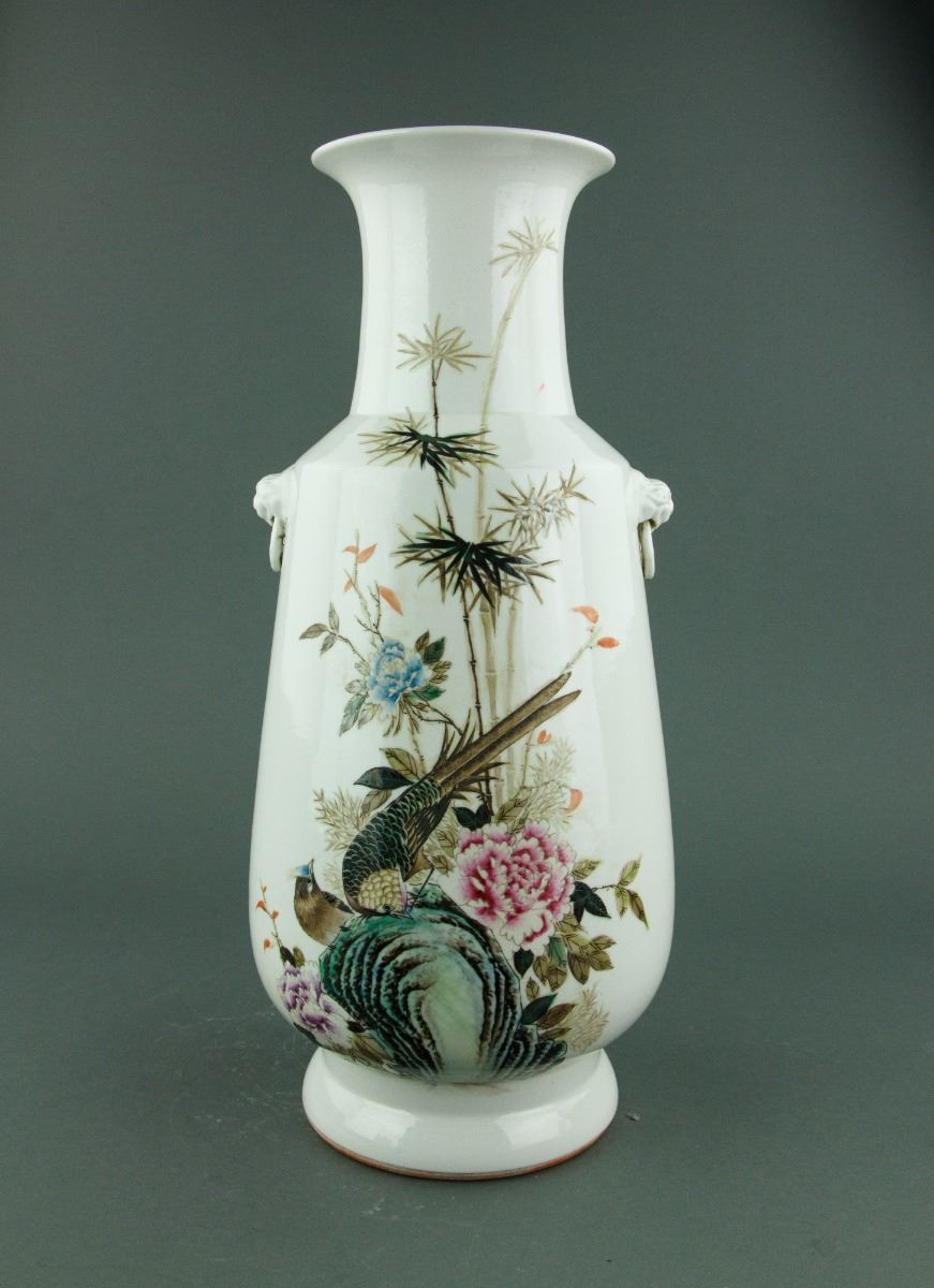 Republic period Chinese Famille rose porcelain vase; of ovoid body with everted mouth and splayed foot; flanked by double lion handles; painted with pheasants and peonies and inscribed with artist Cheng Yiting (Zhushan Bayou) with two red seals; three-character Pei Gu Zhai mark on base; H: 44 cm, D: 21 cm, 3218 grams