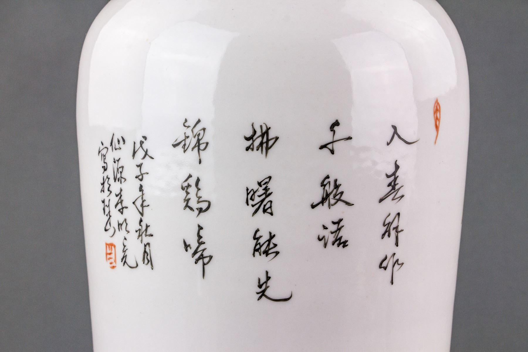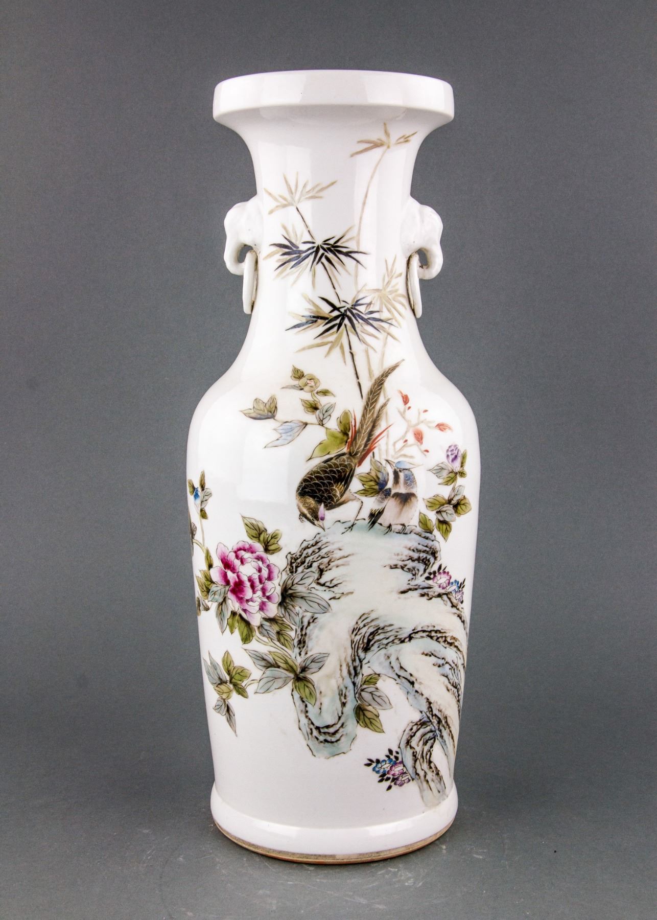 Republic period Chinese Famille rose porcelain vase; of cylindrical body with waisted neck and galleried rim; flanked by double elephant handles; painted with pheasants and peonies; inscribed with artist Li Mingliang with two red seals; two-character Ming Liang mark on base; H: 43 cm, D: 16 cm, 2639 grams