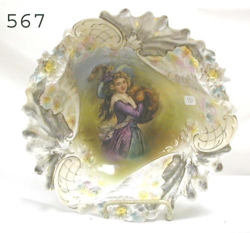 Fine Royal Bayreuth 10 ¼” blown out bowl with Wagner transfer an molded cornucopia border. Some minor wear. Minute rim flake on exterior.