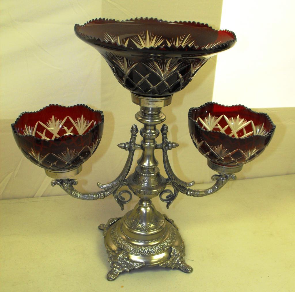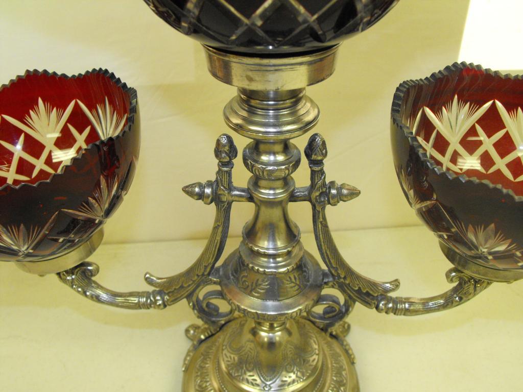 A triple arm ruby glass centerpiece. 17" tallest. No damage