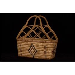 Fine Salish Open Work Gathering Basket with Diamond Imbrication 16" H. 15 1/2" W. 7 1/2" W. Fine Condition