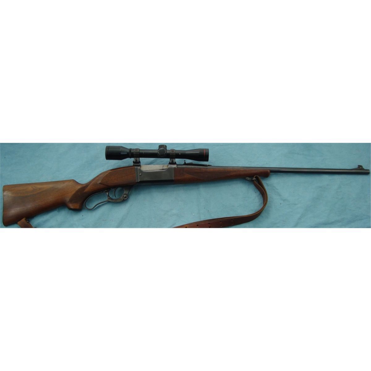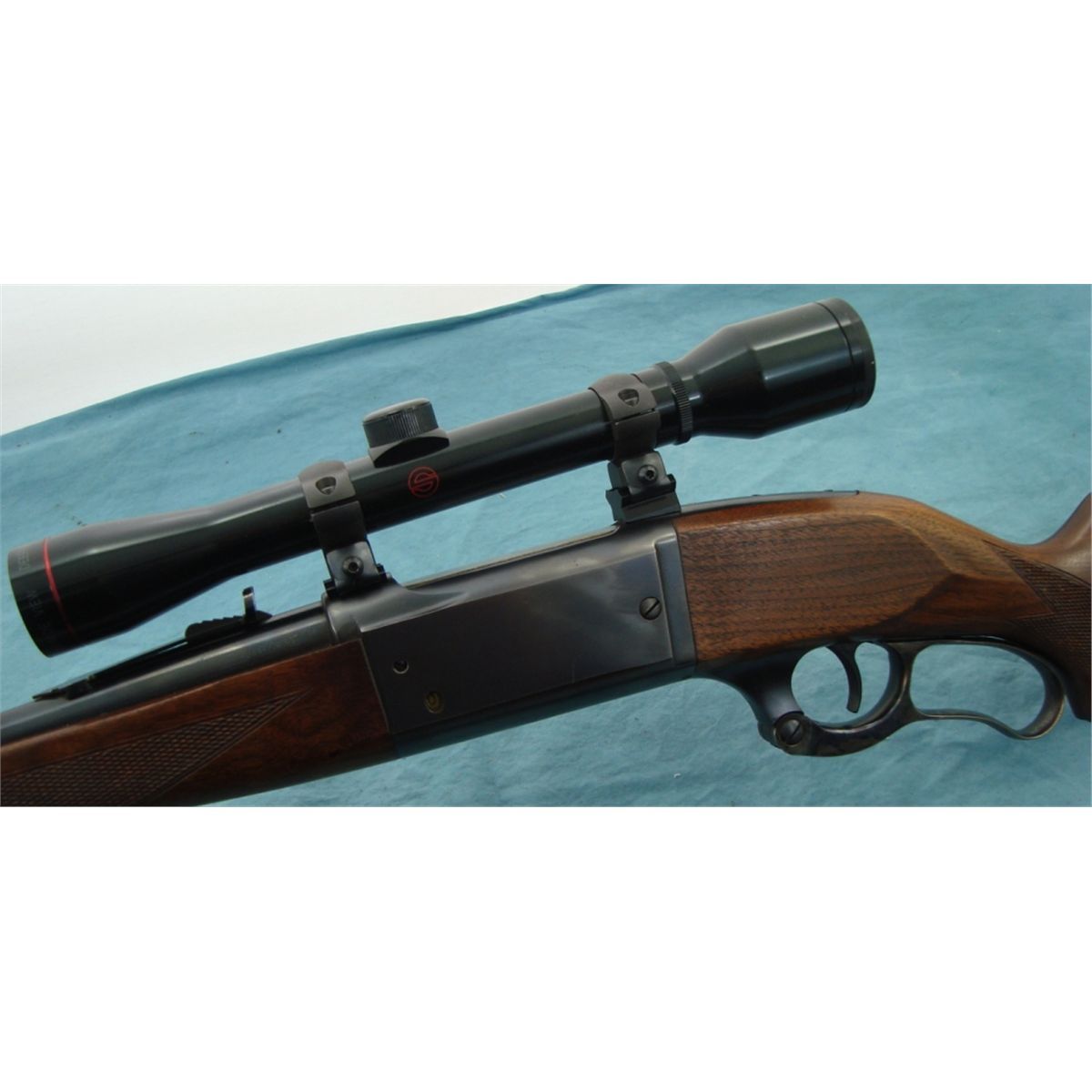 #543501; 300 SAV w/24" round bbl. checkered walnut stock w/pistol grip & case colored lever. Very fine lightly used condition. Complete w/4x32 power scope.