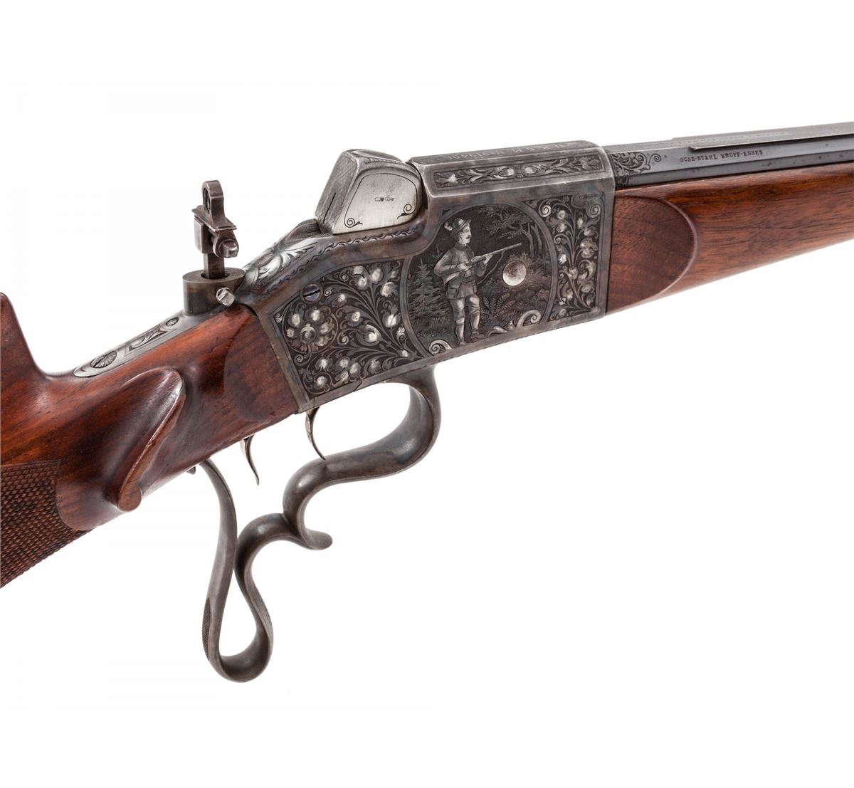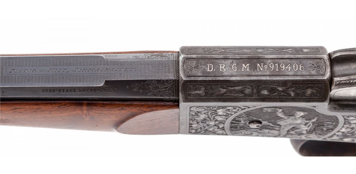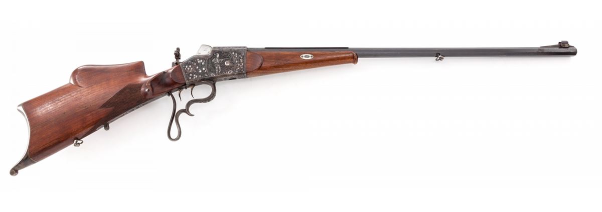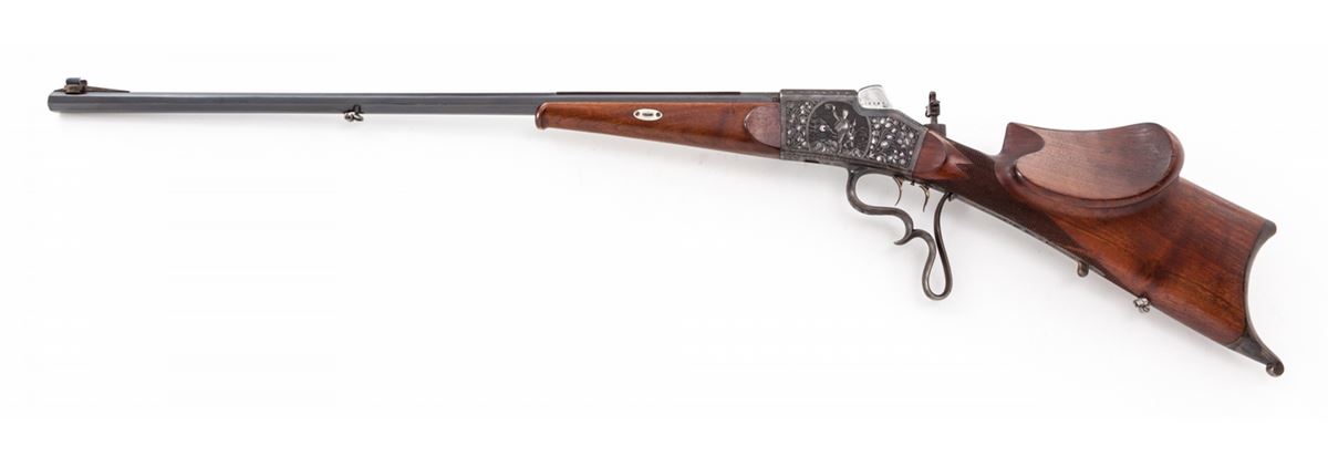Fine Schuetzen Single Shot Rifle, by Pistor & Kost, #14682, 8.15x46R cal., 32'' blue octagon barrel, with finely engraved Jaeger scenes to both sides of frame, case hardened finish to frame, lever, lower tang, and Swiss style buttplate; double set triggers, with protected pin-tip front sight and adjustable peep sight; high cheekpiece checkered Schuetzen buttstock with plain Schnauble tipped forend. Bottom of barrel with ''BUG'' proofmarks, and marked ''7.5M/M'' underneath forend. Matted top barrel flat marked ''Pistor & Kost, Schmalkalden''; top of frame marked in silver ''DRGM No. 919406''. Mfg'd approx. 1923. Condition is excellent showing light thinning to blue at highpoints of barrel flats, 98% vivid case hues. Stock with minor scuffs and one 2'' gouge near lower tang beneath cheekpiece (detracts little). Eyepiece to rear sight is missing. Action remains crisp, set trigger functions correctly, and bore is bright. Est.: $2,500-$3,500. (C&R)