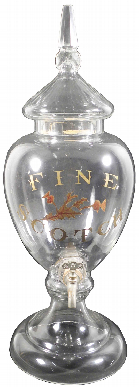 Fine Scotch Back Bar Decanter w/spigot. Small chip on inside of lid otherwise excellent condition. 28 1/2 inches tall.