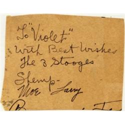<b>367. THE THREE STOOGES </b>Signatures of the Three Stooges on a portion of a tan autograph book page, inscribed by <b>SHEMP HOW...