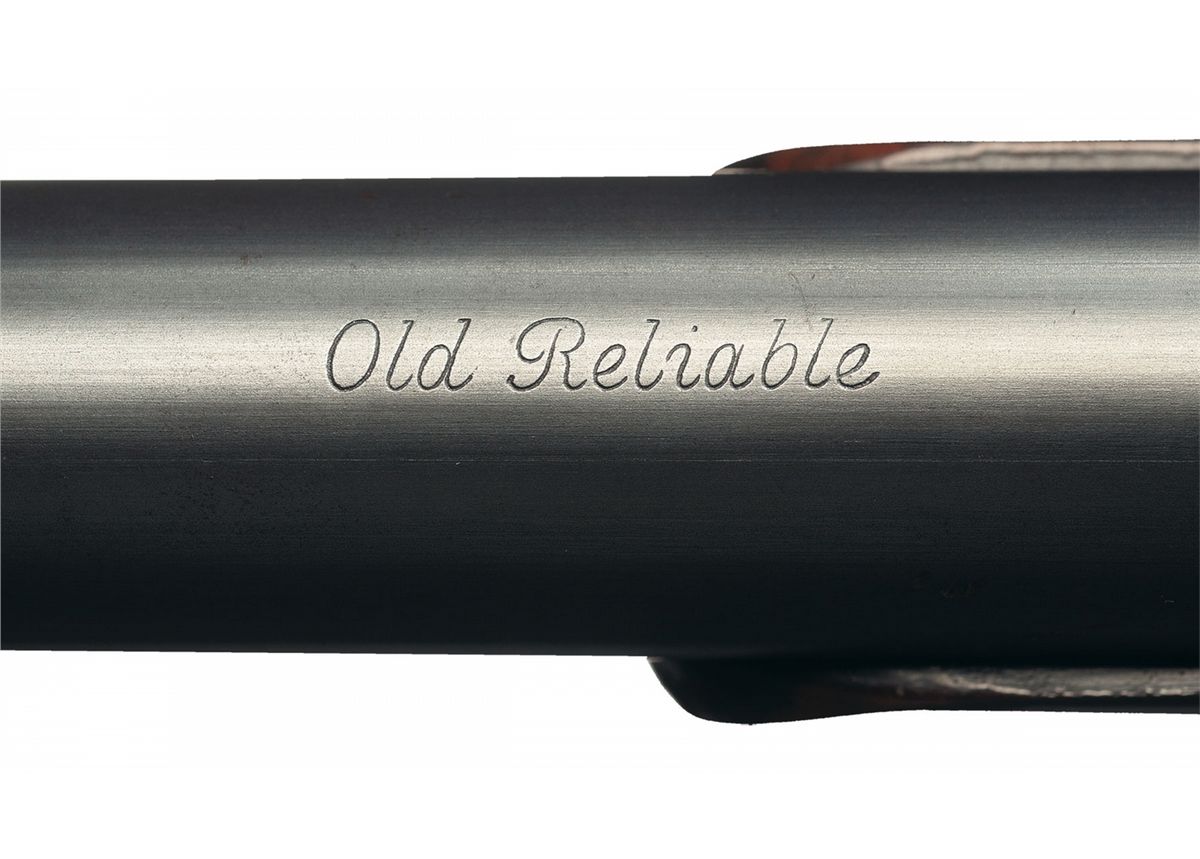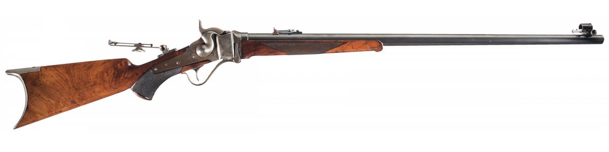 This nice example of a Sharps Model 1874 Mid Range No.1 Sporting Rifle as manufactured at Bridgeport, Conn, was according to Sellers book, "Sharps Firearms", one of only 66 Mid Range Model 1874 rifles produced at Bridgeport. The accompanying copy of the Sharps ledger page, serial number "156975" is listed as a Mid Range No.1(MR #1). 44 caliber with 28" round barrel and that it was shipped on April 6, 1876 to John A. Lowell, 21 Exchange Place, Boston. The rifle has a globe front sight with windage adjustment and spirit level, two folding blade rear sight absent of yard graduation markings and tang mounted replacement vernier mid range peep sight. The top barrel flat is marked "Old Reliable" and "SHARPS RIFLE CO. BRIDGEPORT. CONN." ahead of the rear, the left side of the receiver is marked "SHARPS RIFLE CO/PAT APR 6 1869" and the lock is unmarked. Single trigger, blue barrel and casehardened remaining parts. Mounted with a checkered forearm and pistol grip stock with a nickel plated brass crescent buttplate.