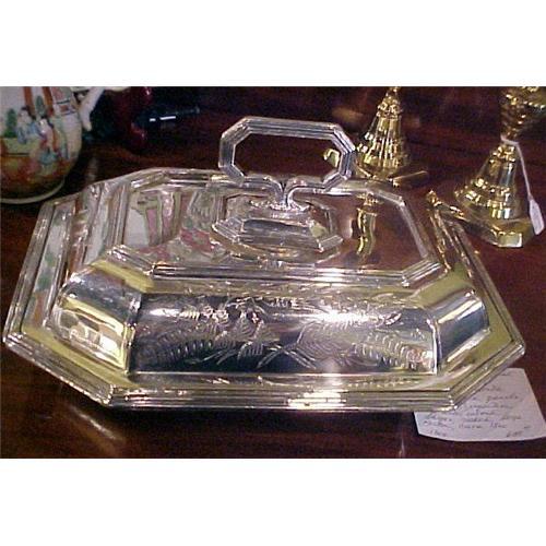 Here we have a very beautiful article with great utility as well. This is a silver plated covered dish, made in Sheffield, England in the late 19th century by George H. Hull. It is decorated on all sides in an engraved bird and fern motif that is quite lovely. The handle is removable, the top sits firmly in the bottom, and there are no flaws except some slight wear to the bottom of the interior, which won't even show in the pictures, and the tiniest possible depression near an edge. It measures 11.5" by 8.5".