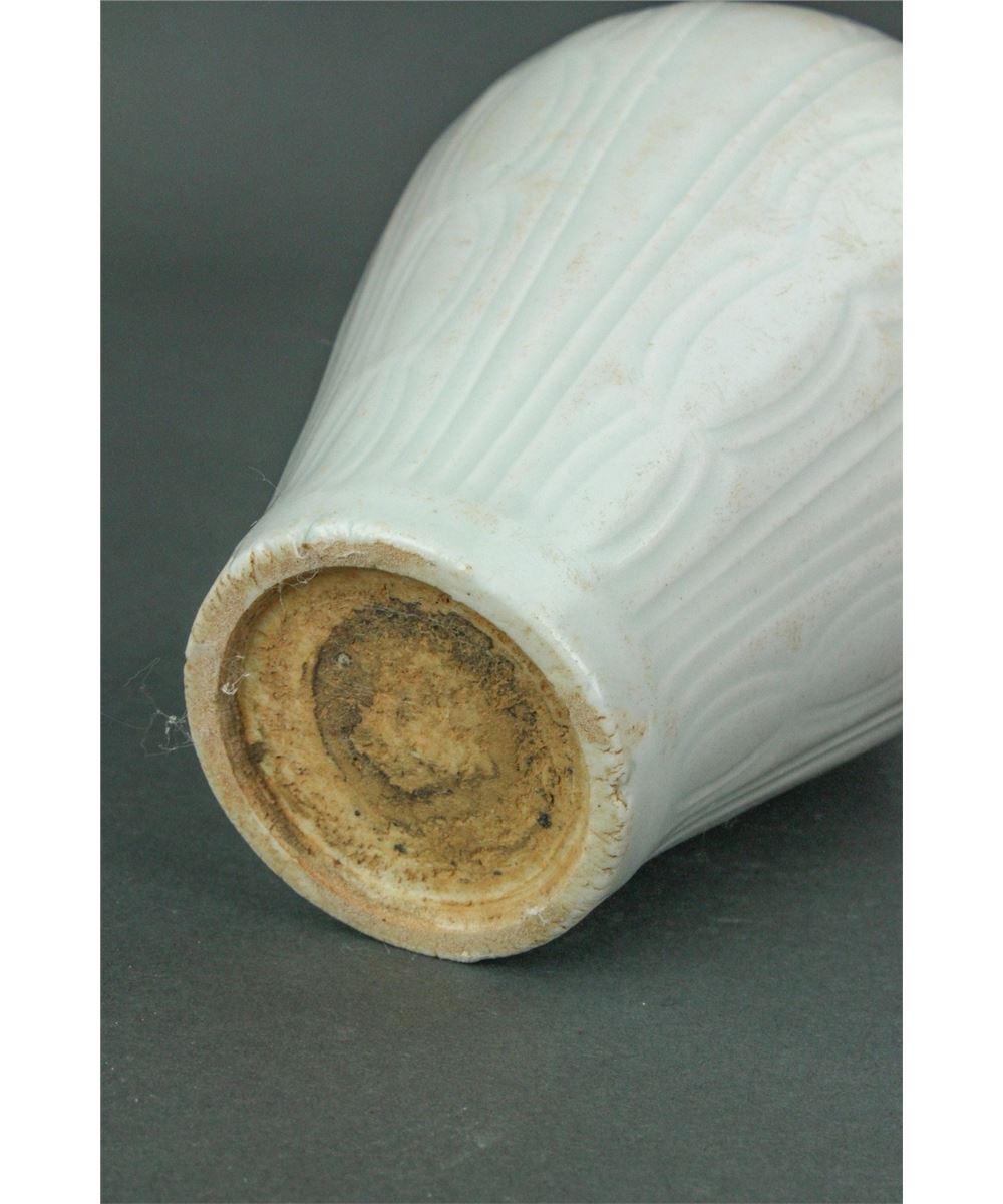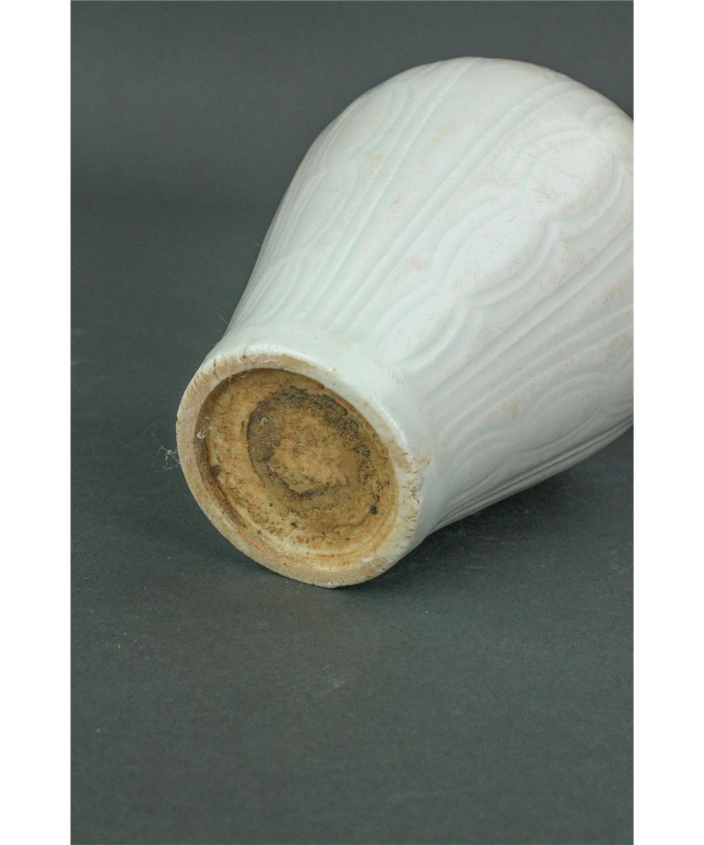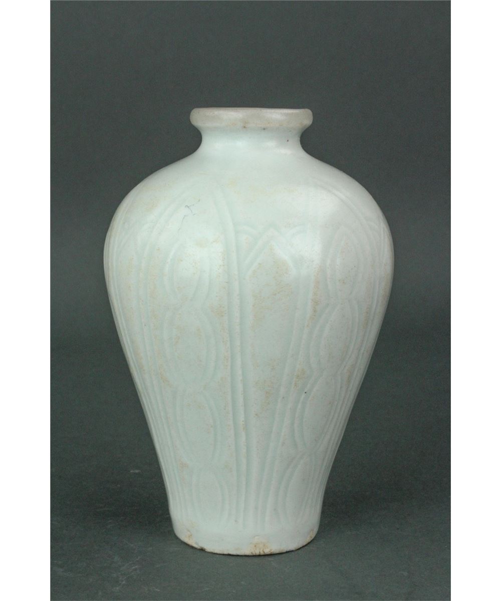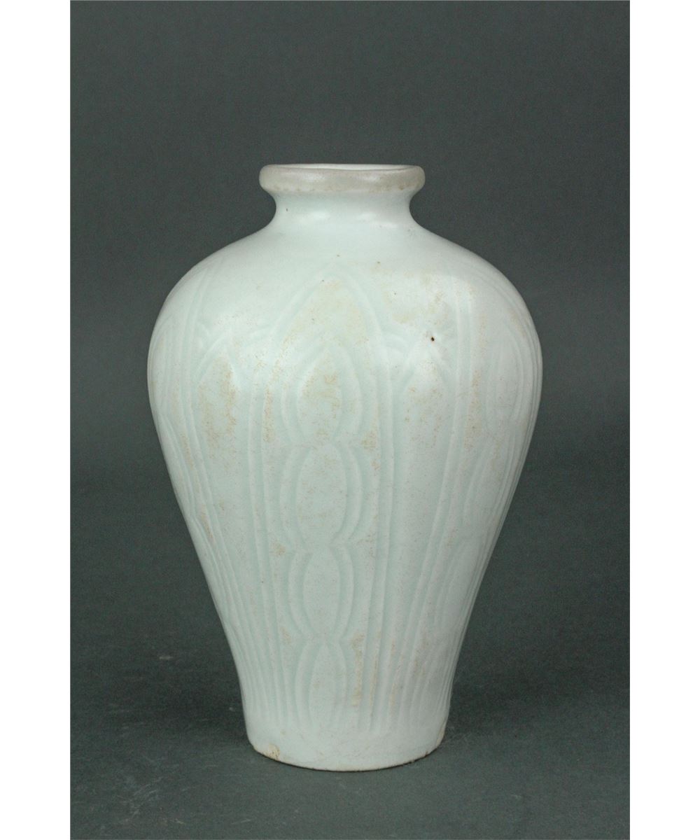 Chinese fine porcelain vase; Song dynasty; of Meiping form; the body carved with lotus petals; applied overall with pale bluish-green Qinbai glaze; H: 12 cm, D: 13 cm, 688 grams