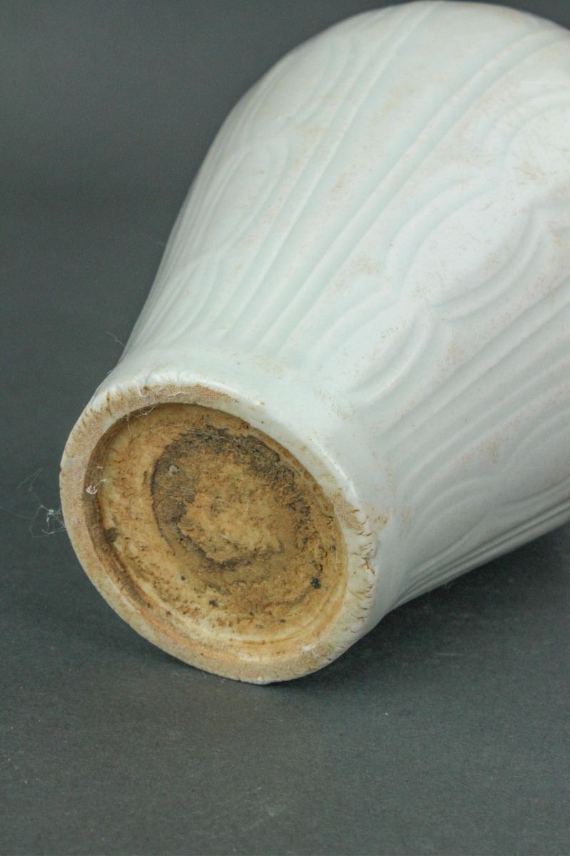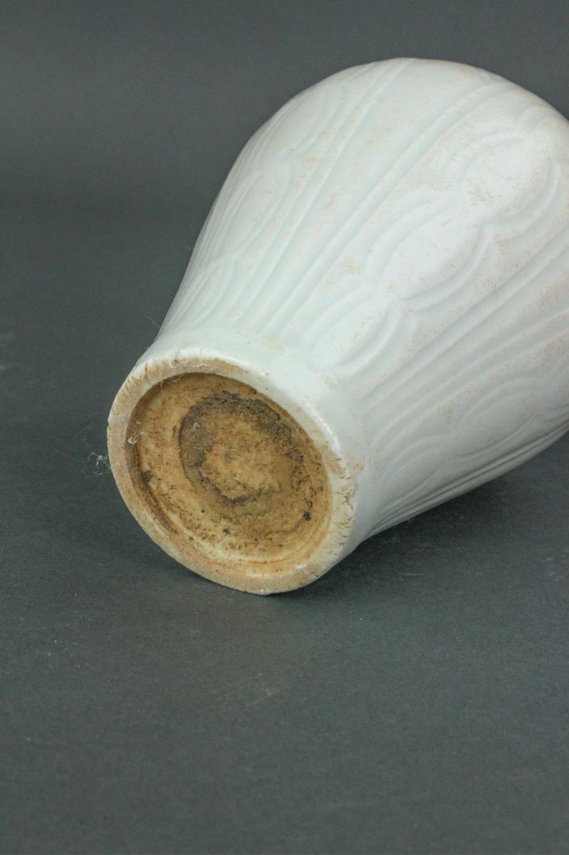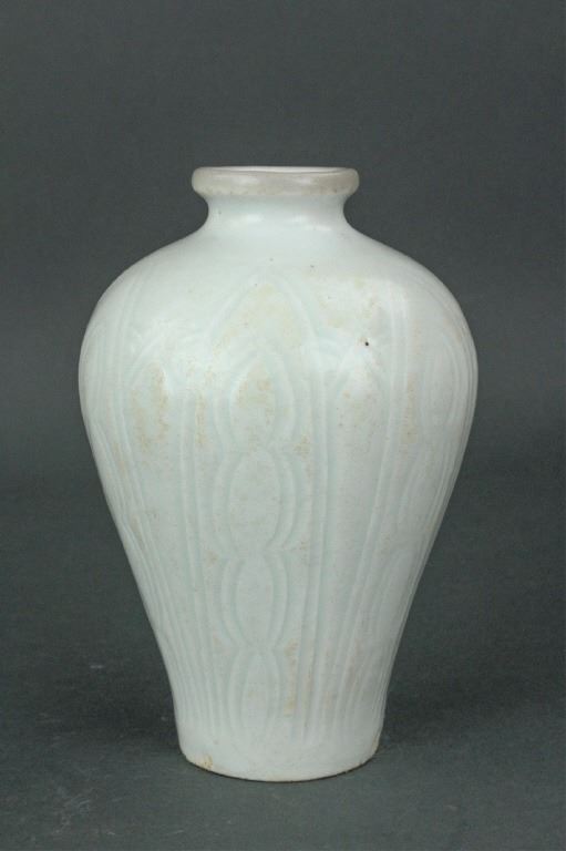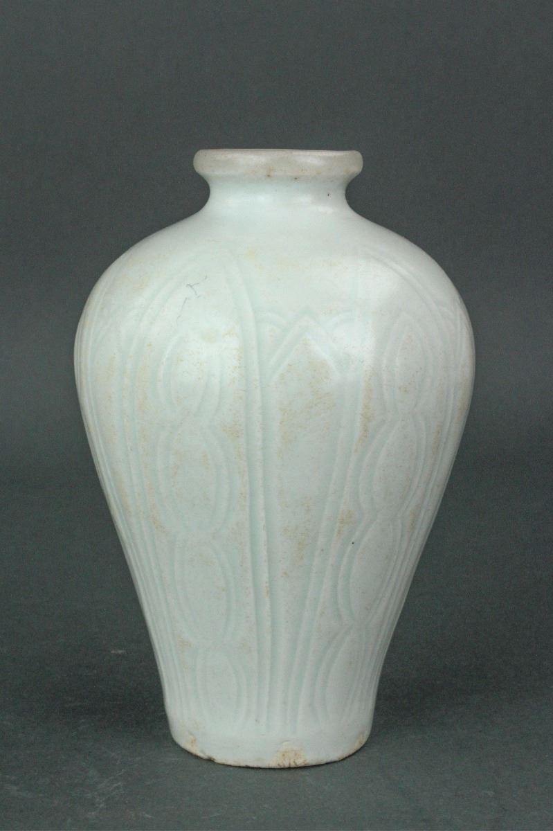 Chinese fine porcelain vase; Song dynasty; of Meiping form; the body carved with lotus petals; applied overall with pale bluish-green Qinbai glaze; H: 12 cm, D: 13 cm, 688 grams