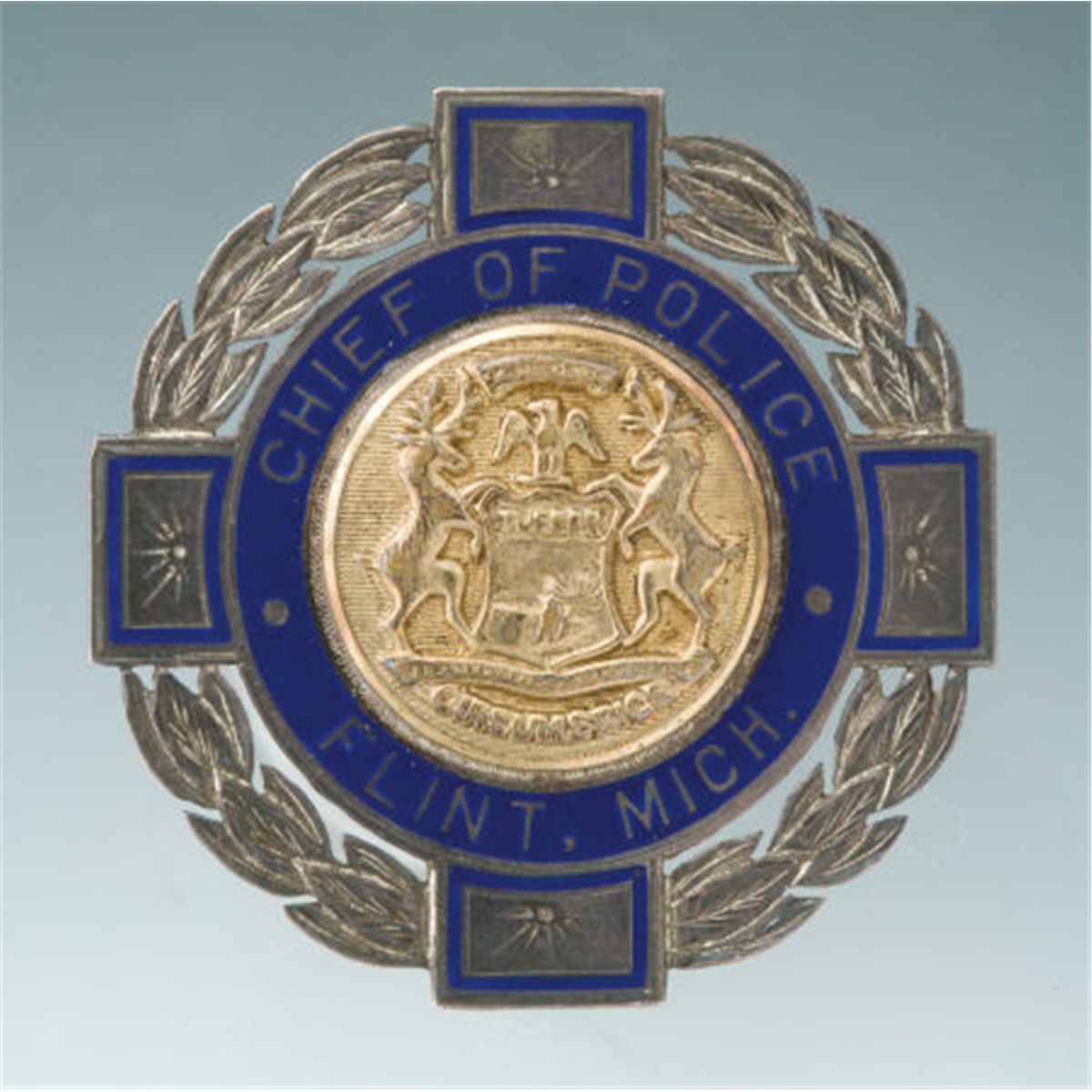 Fine Sterling and Hard-fired Blue Enamel Chief of Police Badge for Flint, Michigan. 1 15/16-inches tall. The flat, finely cut sterling silver badge in the form of a cross, the center blue enamel portion with legend reading: Chief of Police/Flint, Michigan. The appliqued gold metal center of the Seal of the State of Michigan in relief. The bars of the cross are separated by a finely cut laurel wreath, completing the circular design. Back marked: Sterling. Safety catch.Condition: Excellent with light age patina.