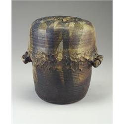 Fine TOSHIKO TAKAEZU closed sculptural stoneware form with hand-modeled top panel, mid-section, and globular pierced handles, with umber, ochre and beige matte dipped glazes. Restoration to two handles on one side, several small chips to mid-section. Incised TT. 15" x 15" $5,500 - 7,500