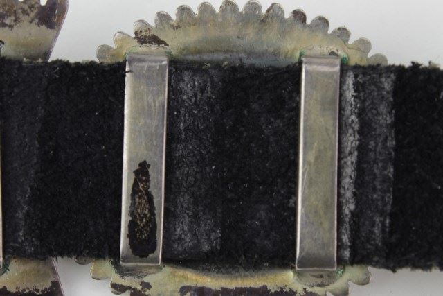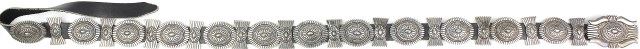 Navajo concho belt with 12 heavy gauge sterling conchos and butterflies and ketoh design buckle. Buckle measures 1 1/2" x 2 1/2", hallmarked on the reverse. Est. 750-1500