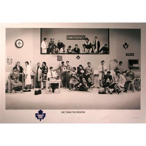 ?Fine Tuning the Operation? is a lithograph by award winning photographer Silvia Pecota. The 1995 Toronto Maple Leafs Team is shown in an elaborate scene where the locker room was transformed into a hospital ward and they are dressed as doctors, patients, surgeons, etc. It is from a limited edition of prints and is numbered 6,646/ 26,721 and is embossed with the official licensed product seal of the NHL, the Western Conference Seal, and the Toronto Maple Leafs seal. The embossed Maple Leafs seal is embellished with metallic blue on the leaf and states: ?Quintology Collection Limited Edition Print Abalene Sport Art Prints? around the perimeter. It is a wonderful, humorous piece that is a must-have for any fan of the ?Original Six? team or collector of Maple Leafs memorabilia.