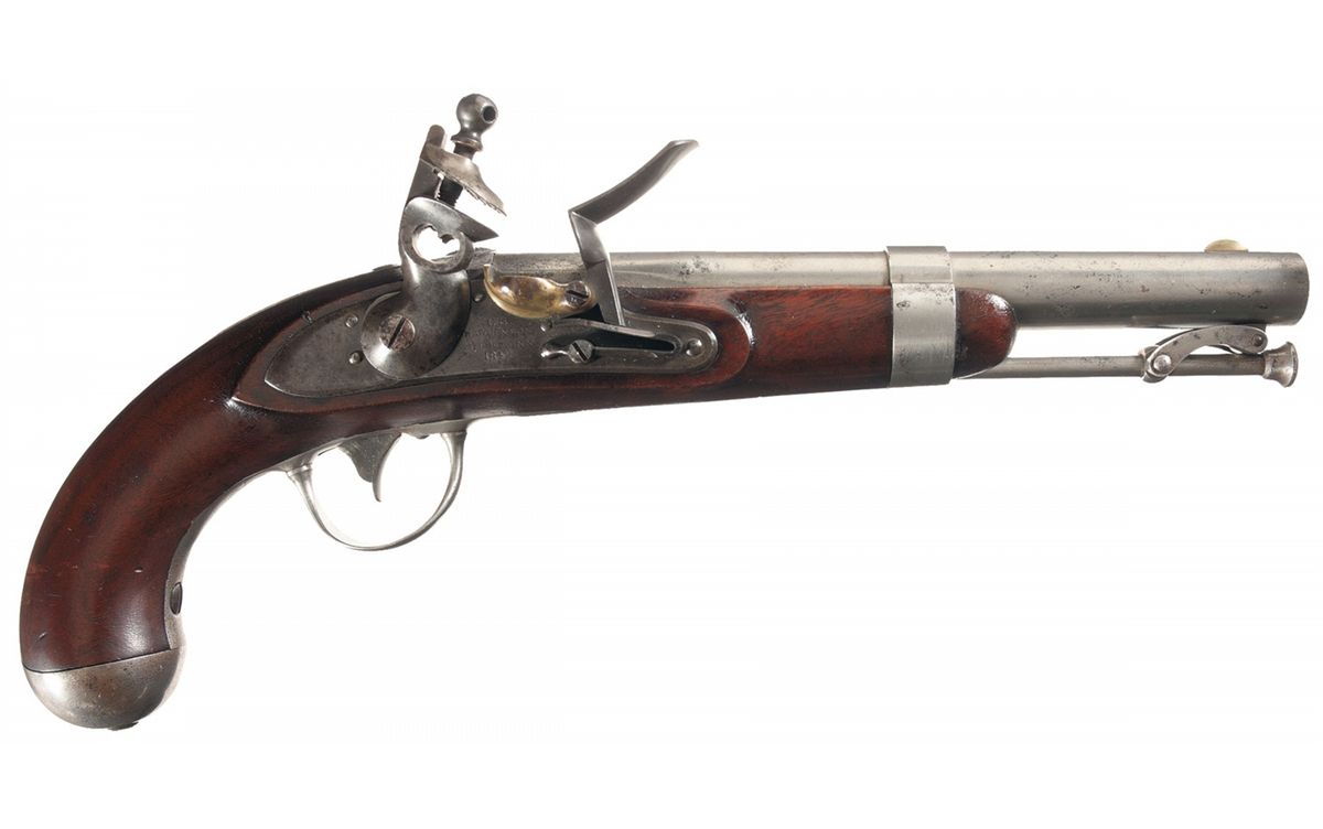 Manufactured in 1842. The pistol has distinctive swivel ramrod with button-shaped head, barrel band with side plate extension and backstrap with integral buttcap. The lock plate is marked "U.S./R. JOHNSON/MIDDN CONN./1842" between the hammer and the frizzen spring. The top of the barrel is stamped "U.S./JCB/P" with small "H" sub-inspector mark stamped on the left rear barrel flat and the lower tang ahead of the trigger guard. The lock has a brass detachable fenced pan, brass blade front and tang mounted oval shaped rear sights. The lock, hammer and frizzen were casehardened, the trigger blue and the remaining iron parts bright. The pistol is mounted with a oil finished black walnut stock with Ordnance Inspector's script initials "WAT" and "JJC" cartouches. Model 1836 Pistols were the primary handgun carried by the Dragoons and Mounted Rifles during the Mexican War and were the last U.S. Flintlock martial pistol. The pistol is widely considered to be the best designed and most attractive of all U.S. Flintlock handguns.