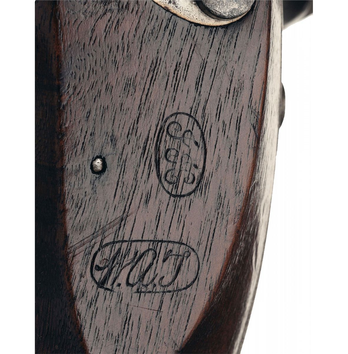 Condition: Fine. The bright components have a crispt silver gray patina with some scattered minor pitting. The lock, hammer and frizzen have a smooth mottled grayish patina. The stock is very fine with a few minor dings, sharp edges on the flats and very crisp cartouches. The markings are crisp and clear. The action is excellent.