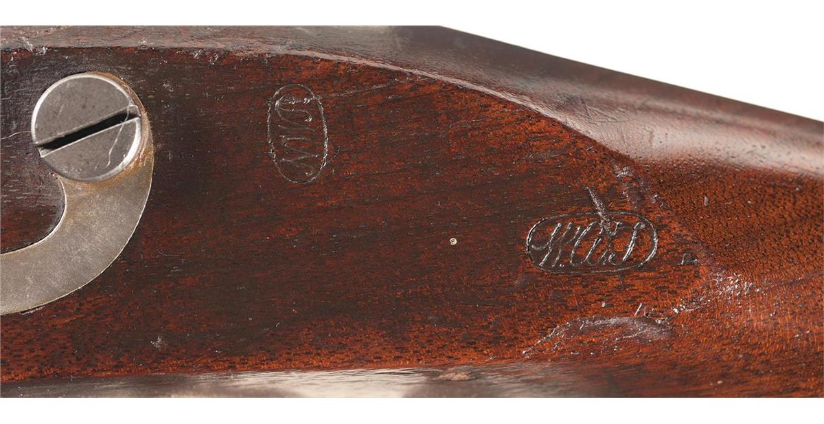 Fine. The musket has a bright appearance showing a few areas of minor pitting. The front sight is missing. The stock is very fine with a hairline crack near the lock and some minor pressure dents. The cartouches are crisp. Mechanically excellent.
