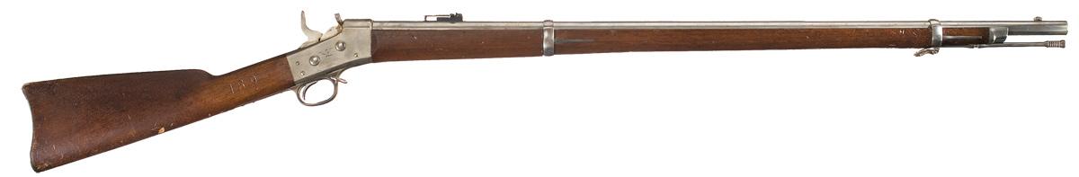 This is a fine representative example of a U.S. Springfield Armory Model 1871 Rolling Block Rifle, as made on a royalty agreement with Remington in 1871 and 1872 with a total production of 10,000. The left side of the frame is marked "MODEL 1871, the right side with the eagle shield motif over "U.S. / SPRINGFIELD / 1872" and the upper tang is marked with two line address/patent dates. The rifle is finished armory bright with a casehardened action. Square base front sight and adjustable folding leaf rear sight graduated to 900 yards. The rifle is fitted with a double stop cleaning rod with slotted tip, sling swivel mounted on the front of the trigger guard and a split swivel on the forward sling swivel. The rifle is mounted with a smooth full forearm with iron end cap and straight grip stock with a sharp "ESA" oval cartouche on the left wrist and carbine style buttplate marked "U.S." on the tang.