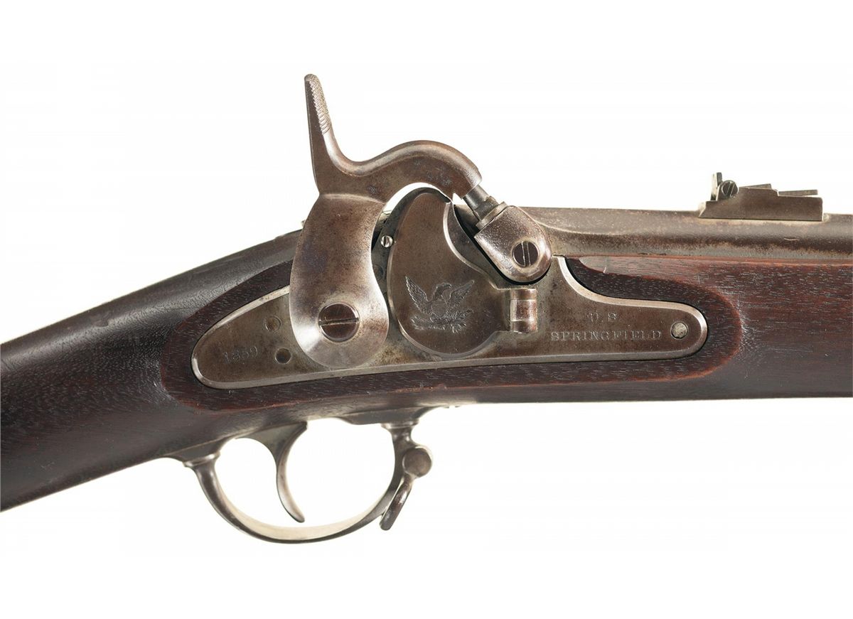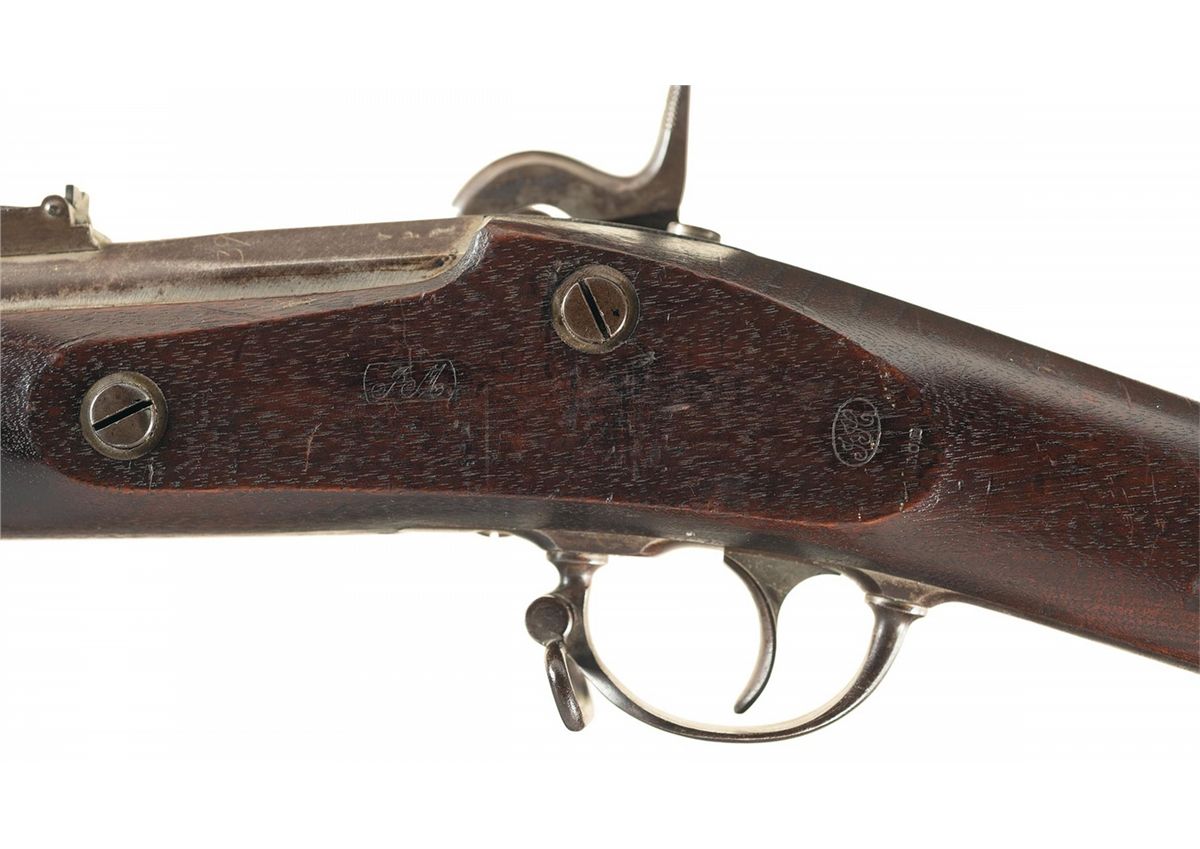 Blade front and 3-leaf rear sight, with "1859" on the top flat and "39" hand-marked on the upper right ahead of the "V/P/eagle head" stamp. The lock plate is marked "1859" behind the hammer, with the Springfield eagle and shield motif on the primer door and "U.S./SPRINGFIELD" ahead. Smooth straight wrist stock, with oval "JM" and "JH" cartouches on the left side opposite the lock, along with an "E.C.H." stamp, and the buttplate is marked "US" on the heel. With a wooden muzzle plug.