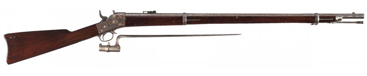 Manufactured by Springfield Armory on royalty agreement with the Remington Arms Co. from 1871 to 1872. The right side of the receiver has the eagle/shield motif above "U.S./SPRINGFIELD/1872" and the left side is marked "MODEL 1871". The upper tang has the two line Remington patent dates marking (traces remain) and the two barrel bands are stamped with the letter "U". Ladder rear sight, cleaning rod and sling swivels with a smooth full length stock fitted with a "US" marked buttplate. The right side of the buttstock is stamped "HH" with the left side of the wrist having a clear script "ESA" cartouche. Included is a "US" marked socket bayonet.