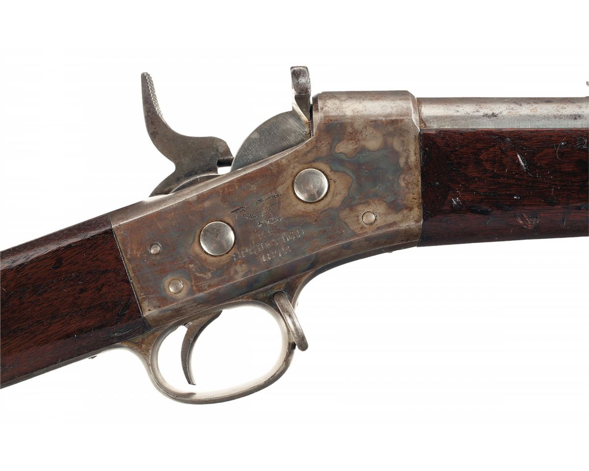 Condition: Very fine. The receiver, breechblock and hammer retain 70% original case colors. The remaining armory bright metal surfaces have a mottled gray patina with a rust spot on top of the barrel. The stock is also very fine with some minor pressure dents and scratches and a hole drilled near the lower tang. The cartouche is crisp. Mechanically excellent.