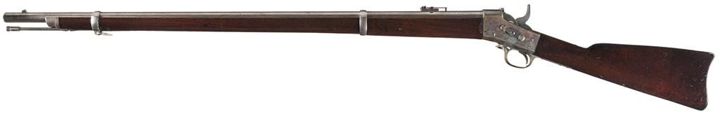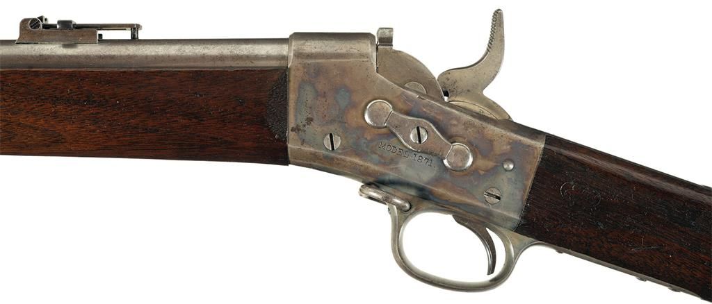There were only 10,001 of these rifles manufactured between 1871 and 1872 by Springfield Armory who had a royalty agreement with Remington Arms Company. The right side of the receiver is stamped with the eagle/shield motif above "U.S./SPRINGFIELD/1872" with the left side stamped "MODEL 1871". The upper tang has the two-line Remington patent date (1864 and 1868) marking and the two barrel bands are marked with the letter "U". It has a blue ladder rear sight and a bright cleaning rod. Mounted with a smooth walnut forearm and straight grip stock with an oval "ESA" inspector cartouche and a buttplate stamped "US" on the tang. The barrel, barrel bands, trigger, hammer, buttplate, rolling block, pivot pins and pivot pin retainer are polished bright. The receiver and trigger guard are color casehardened.