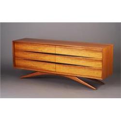 Fine VLADIMIR KAGAN six-drawer cherry dresser with channeled case and sculpted drawer fronts with recessed black lacquered pulls on whalebone legs. (A classic design from an important Kagan commission.) Unmarked. 31" x 80" x 19" $6,000 - 8,000
