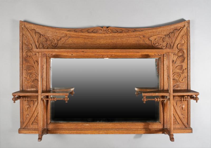 With ring and bobbin turnings, with center shelf and two additional half moon shelves, the back carved with floral and swag decorations, original beveled glass mirror. 30.5" H x 46" W, circa 1900, minor wear to surface, otherwise very good condition.
