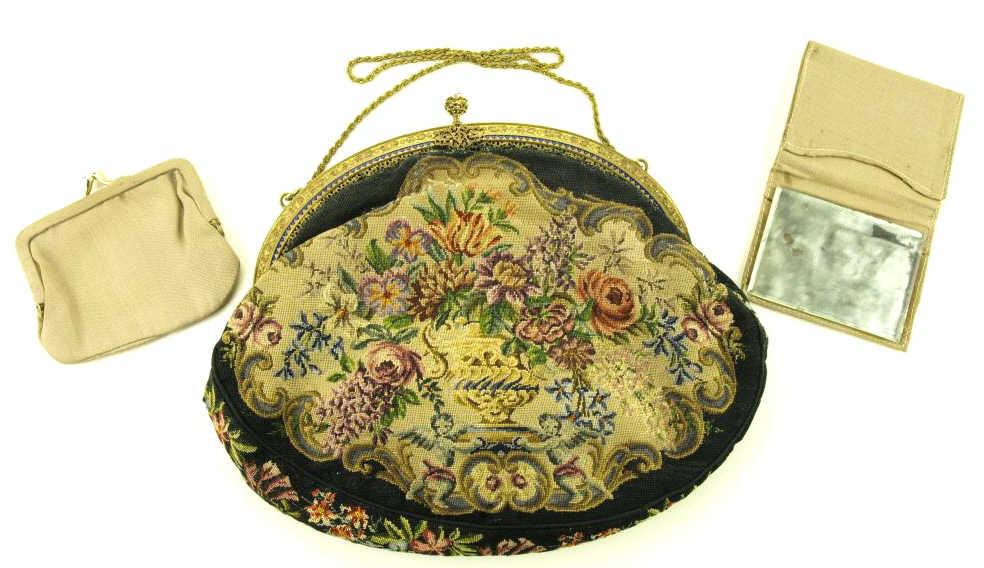 with jeweled & enameled frame set with carved Italian cameo. Original braided chain & inner coin purse. Light separation to cloth on back. 7 1/2" X 9".